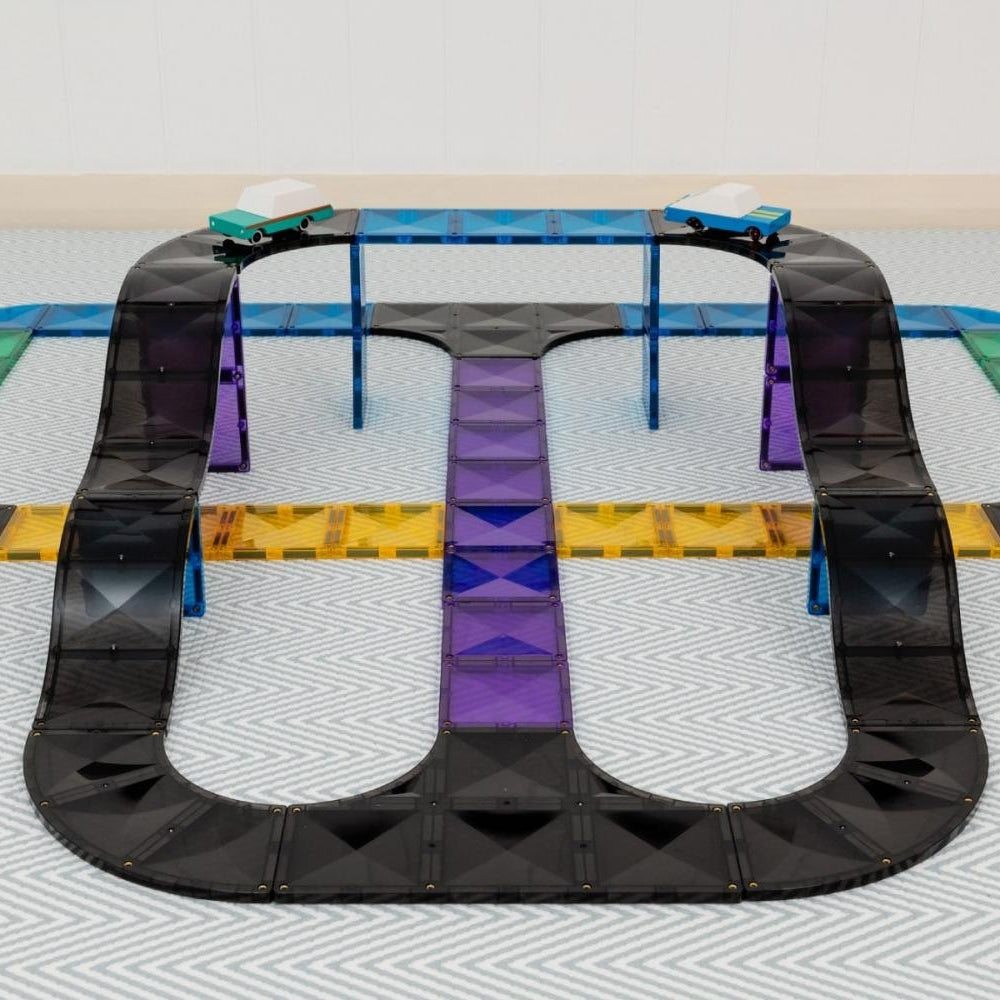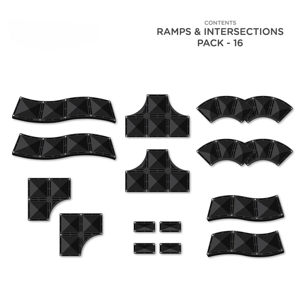 Súprava 16 dielov ciest, rámp a križovatiek od spoločnosti Connetix obsahuje jedinečné tvary magnetických kociek inšpirované cestami vrátane štvrťkruhov, kriviek, križovatiek a dlhých a krátkych rámp, to všetko v elegantnom čiernom odtieni.