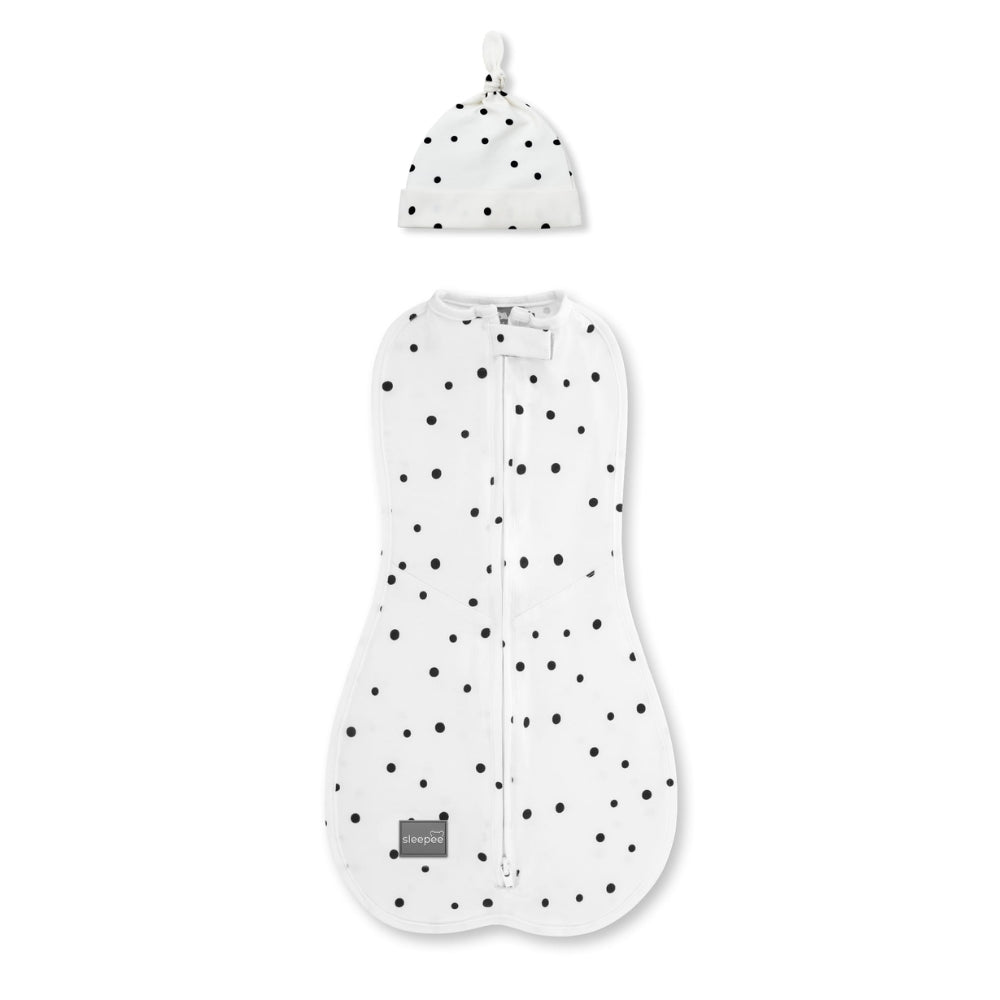 Detská zavinovačka First Step s čiapočkou Black dots od spoločnosti Sleepee pomáha organizovať cyklus spánku a bdenia vášho bábätka, pričom obnovuje to, čo sa vaše bábätko naučilo už v matkinom brušku.