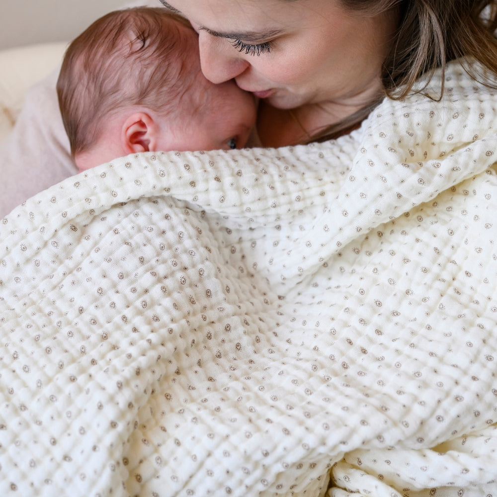 Bavlnená deka je vyrobená zo 4 vrstiev vzdušnej organickej bavlny s certifikátom GOTS, vďaka čomu je jemná k pokožke a príjemná na dotyk.