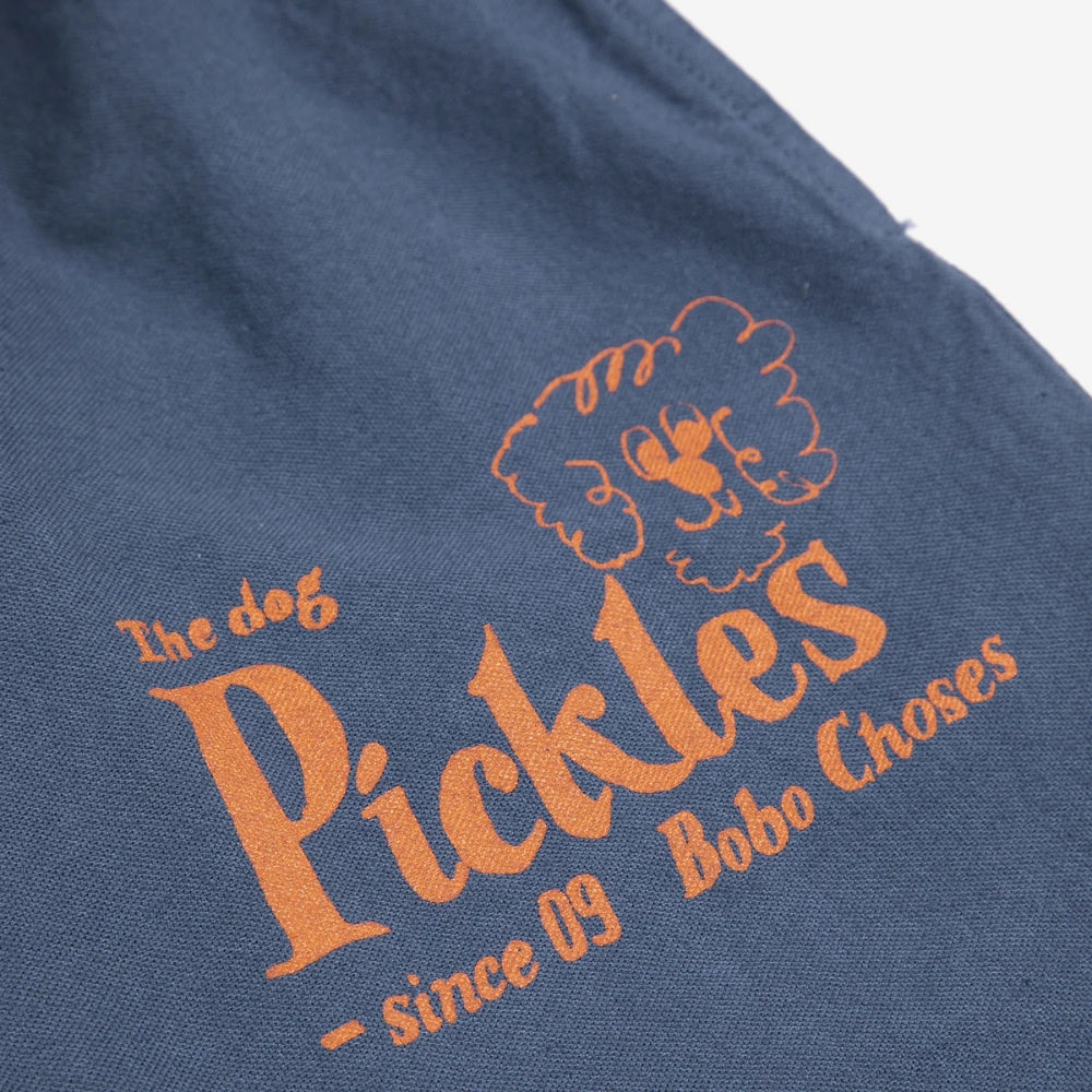 Tmavomodrá farba v kombinácii s výraznou potlačou "Pickles the Dog" dodáva celkovému vzhľadu jedinečný umelecký nádych, ktorým je značka Bobo Choses známa.