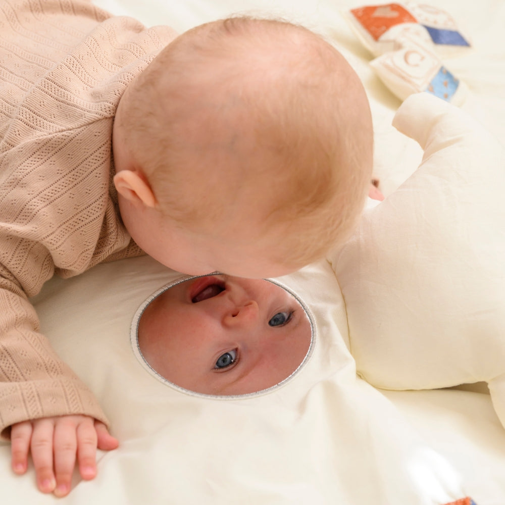 Zabudované prvky ako pískatko, zrkadlo a šuštiaci papier poskytujú veľa zábavy a zároveň podporujú zmyslový a motorický rozvoj.