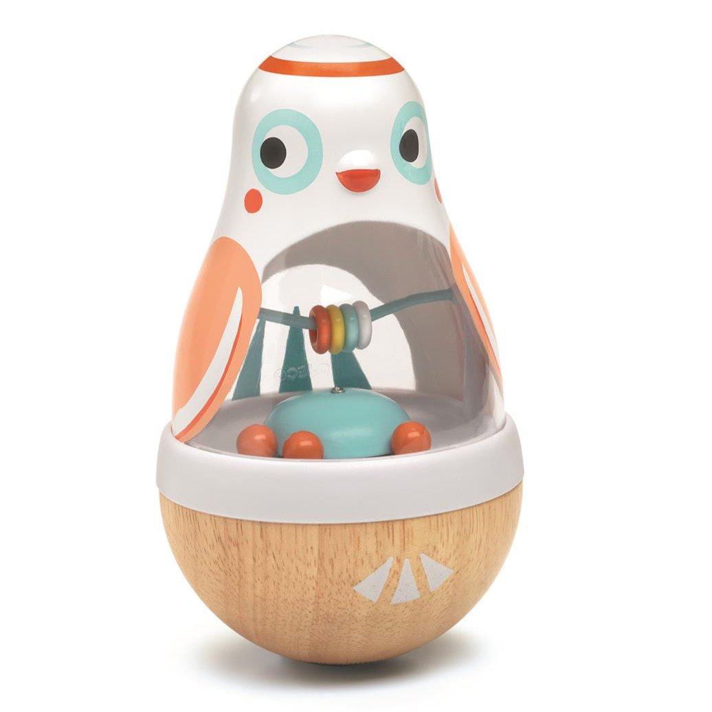 Hračka sa pohybuje zo strany na stranu, ale vďaka zaoblenej základni sa nikdy neprevráti.