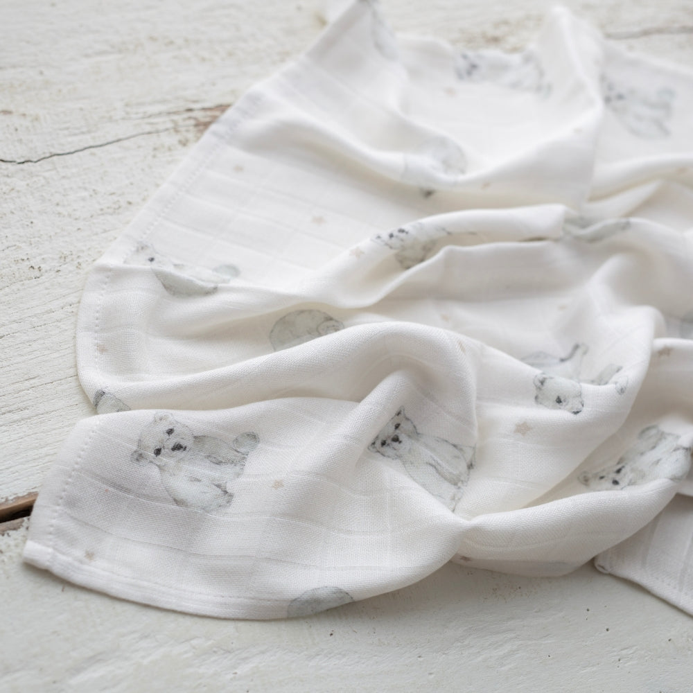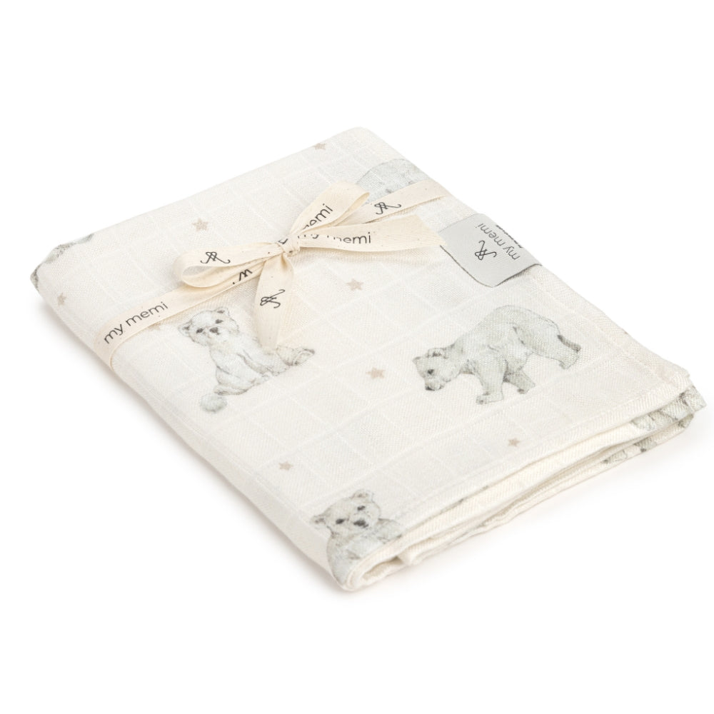 Bambusová mušelínová zavinovačka 120x120 cm medvedíky od Memi je mimoriadne mäkká a príjemná na dotyk.
