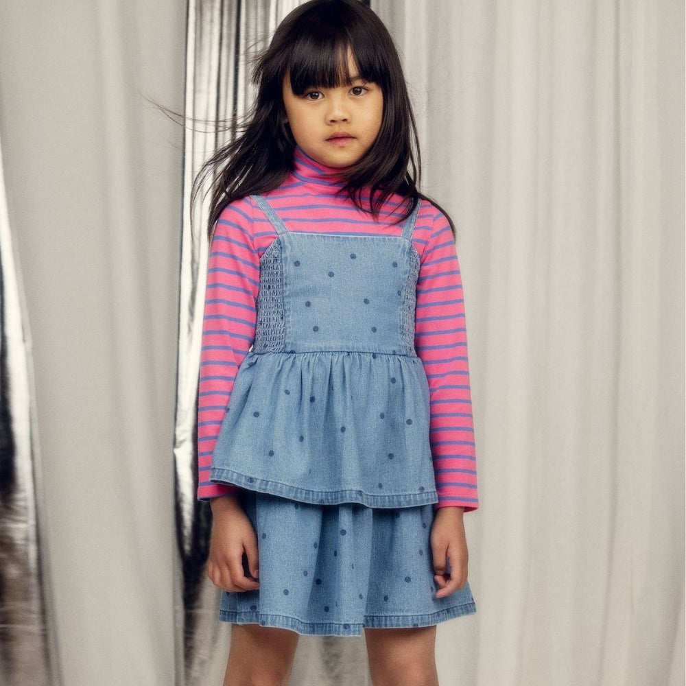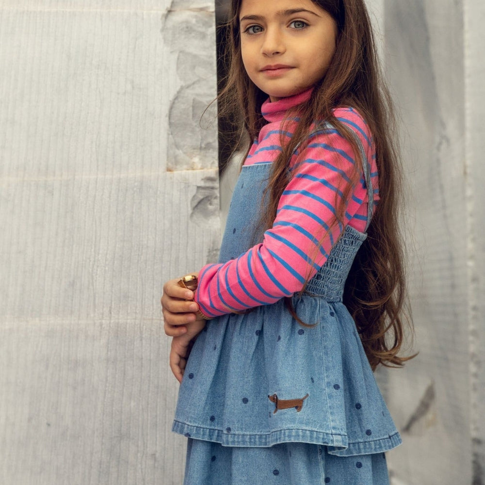 Jemný bodkovaný vzor a vyšívaný motív psíka na spodnom leme zdôrazňujú detský, hravý štýl charakteristický pre Mini Rodini.