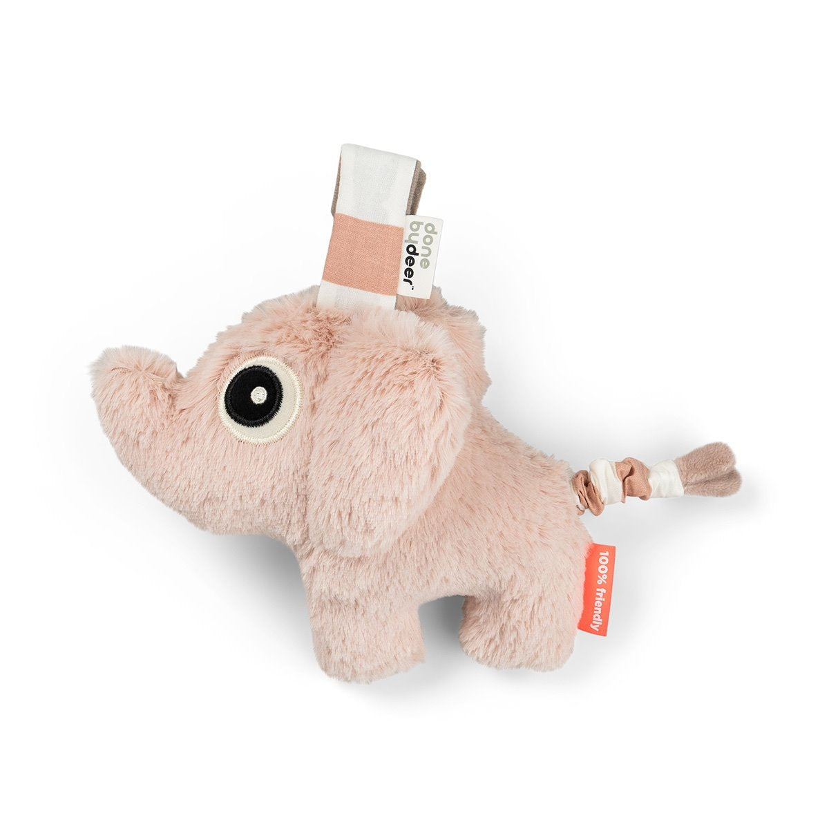 Spoločnosť Done by Deer si dala záležať na praktických detailoch, ako je napríklad pohodlné zapínanie na suchý zips, ktoré uľahčuje pripevnenie hračky doma alebo na prechádzke.