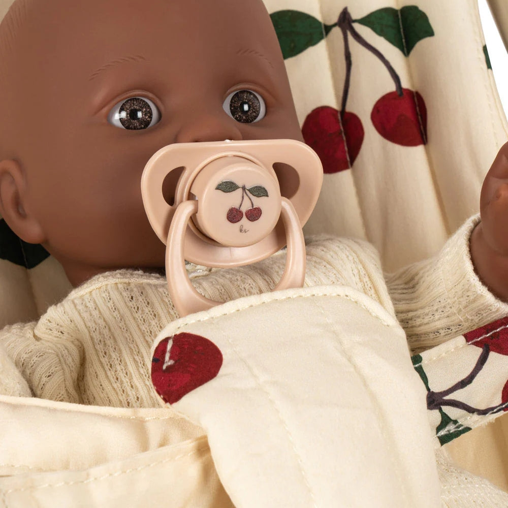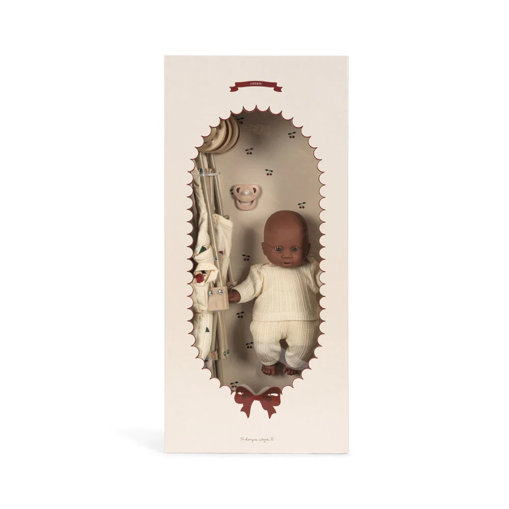 Súprava Konges Slojd Cherie je ideálnym darčekom pre najmenších milovníkov hry na domček. Obsahuje klasický kočík pre bábiky v nadčasovom čerešňovom vzore a rozkošnú bábiku, ktoré spolu tvoria súpravu pripravenú na hru ihneď po vybalení z krabice.