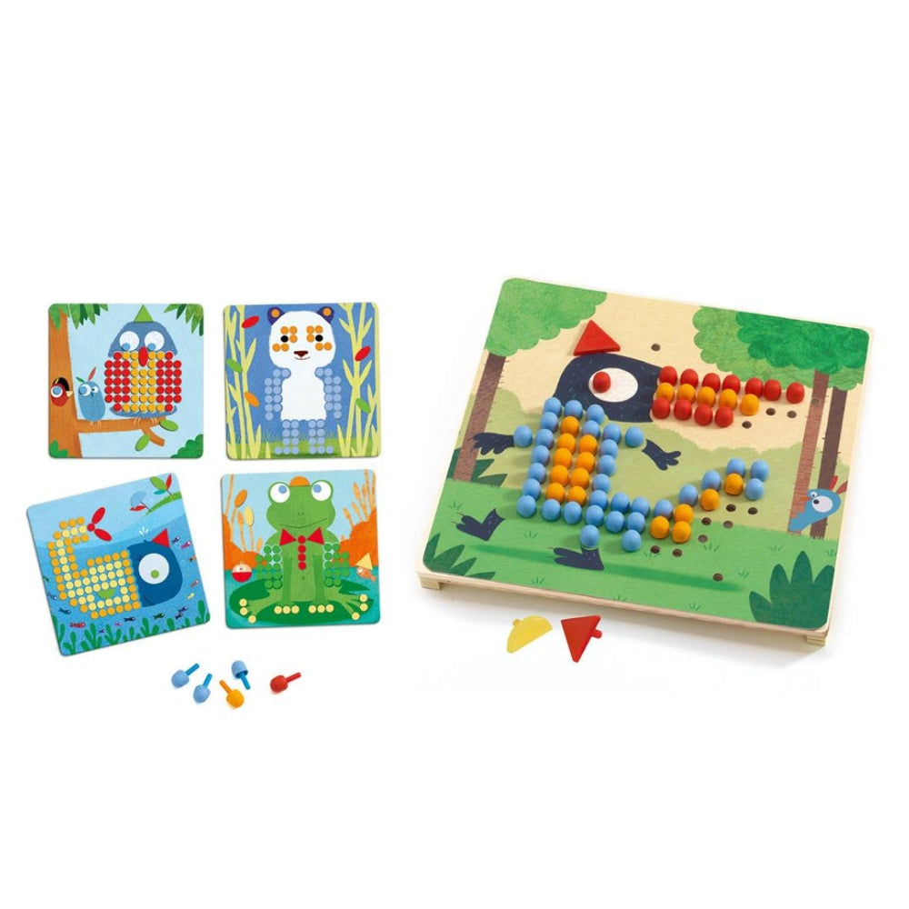 V tejto súprave si batoľa skladá farebnú mozaiku zatláčaním plastových kolíčkov do pripravených obrázkov s otvormi.