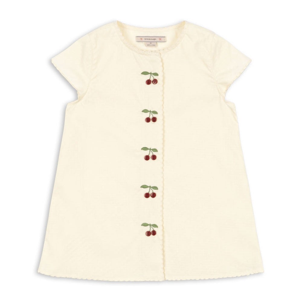 Na prednej strane šiat pre dievčatá je výšivka a ozdobné gombíky v tvare malých čerešničiek, ktoré upútajú pozornosť a podčiarkujú letný štýl.