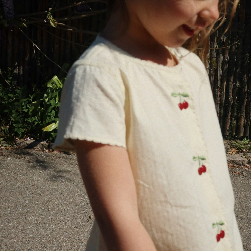 Dievčenské šaty Konges Slojd Evia Cherry sú ľahkou letnou voľbou, ktorá kombinuje jednoduchý strih s rozkošnými detailmi.
