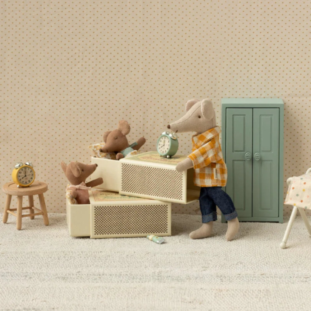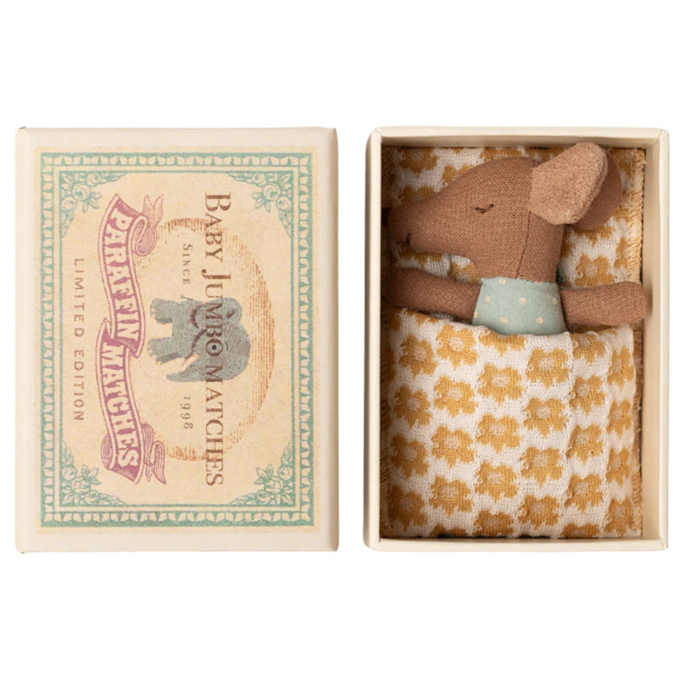 Maileg Spiaca myška v škatuľke od zápaliek Modrá