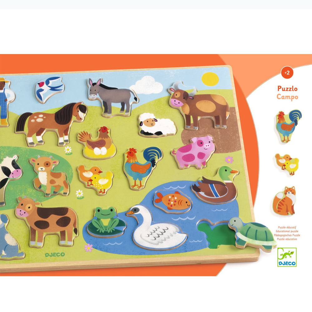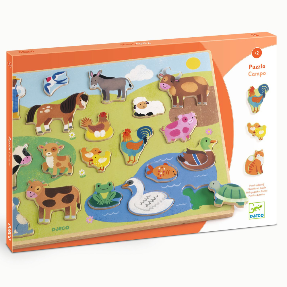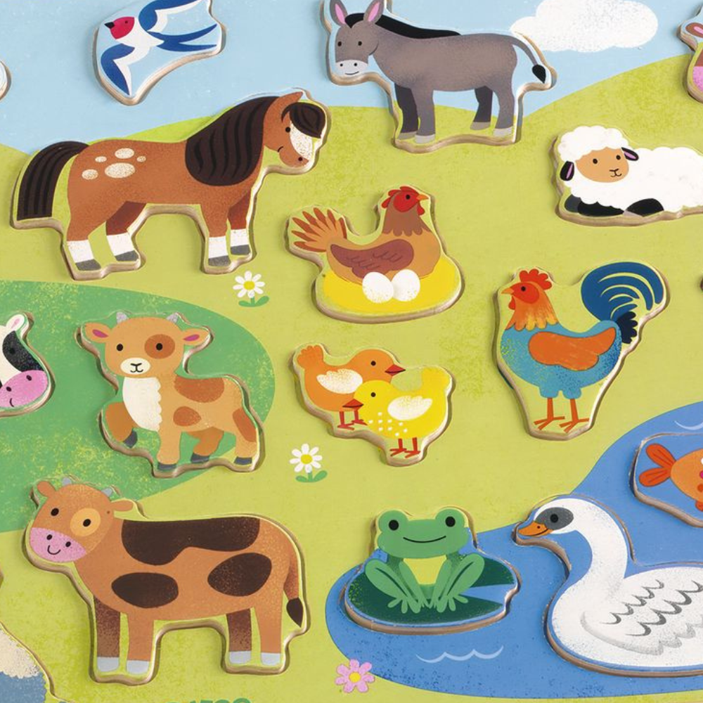 Drevené puzzle s motívom farmy od spoločnosti Djeco.