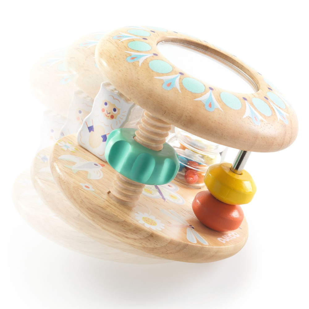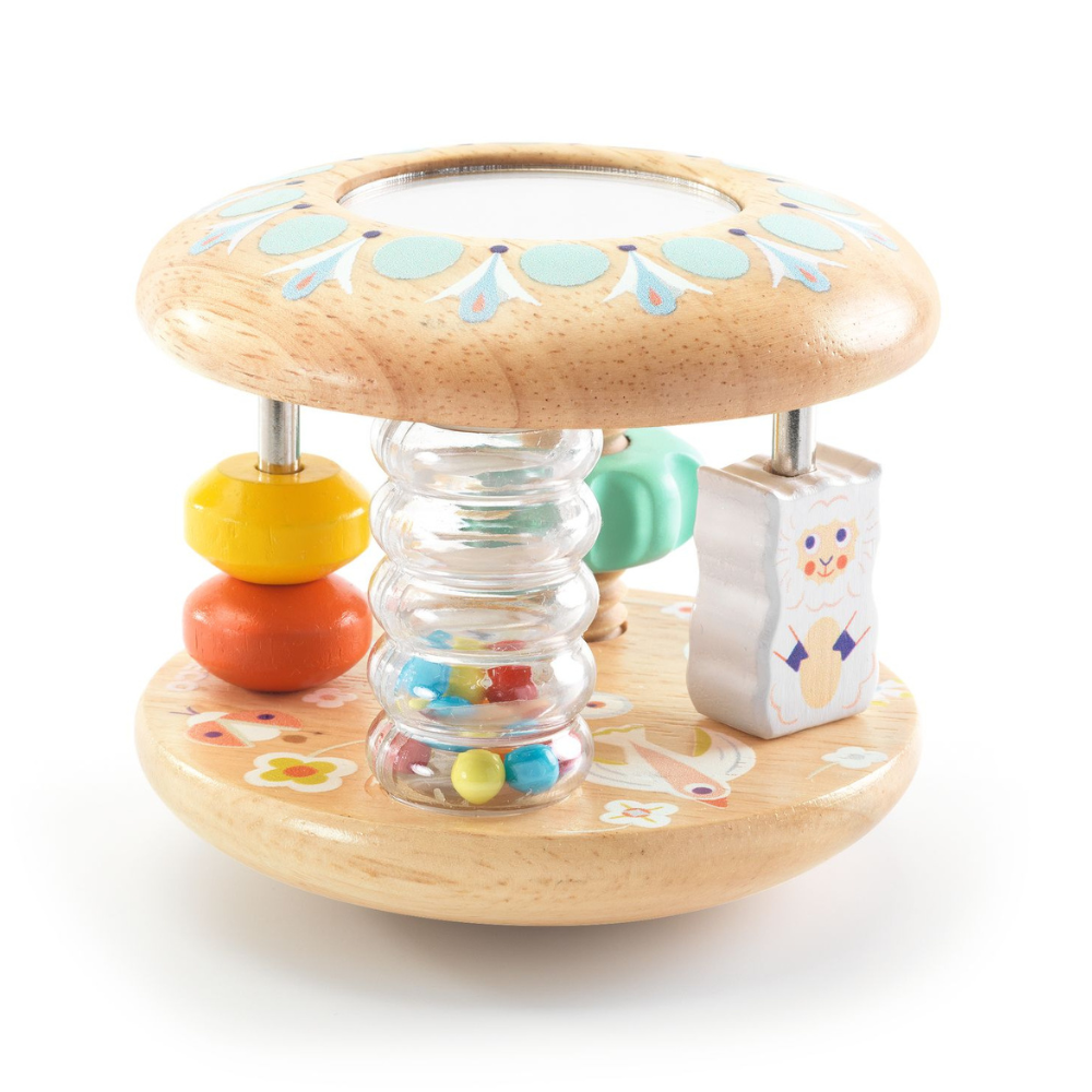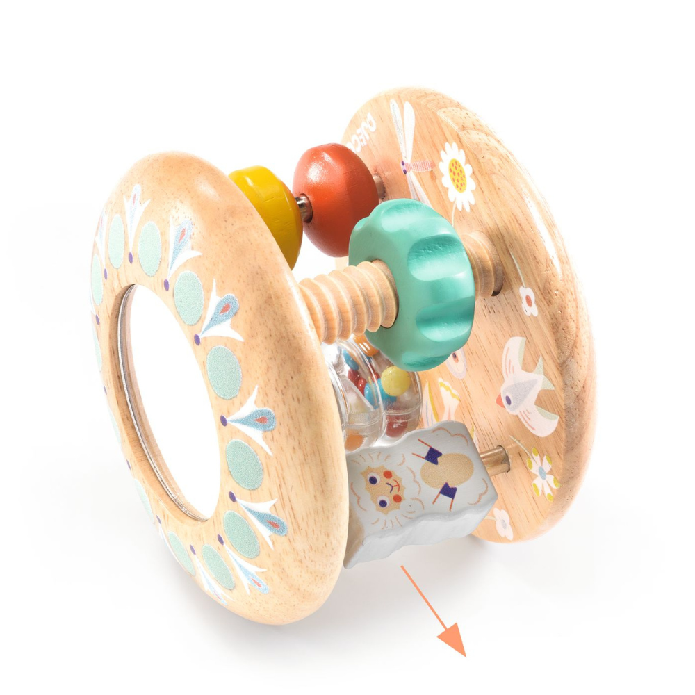 Táto kompaktná hračka v jemných pastelových farbách bola vyrobená z prírodného dreva a vyzýva vaše dieťatko k preskúmaniu až šiestich aktivít: otáčanie ovečky, pohybovanie korálkami, prevracanie položenej na boku, pozorovanie padajúcich korálok, skrutkovanie kvetinky a pozeranie sa do zrkadla.