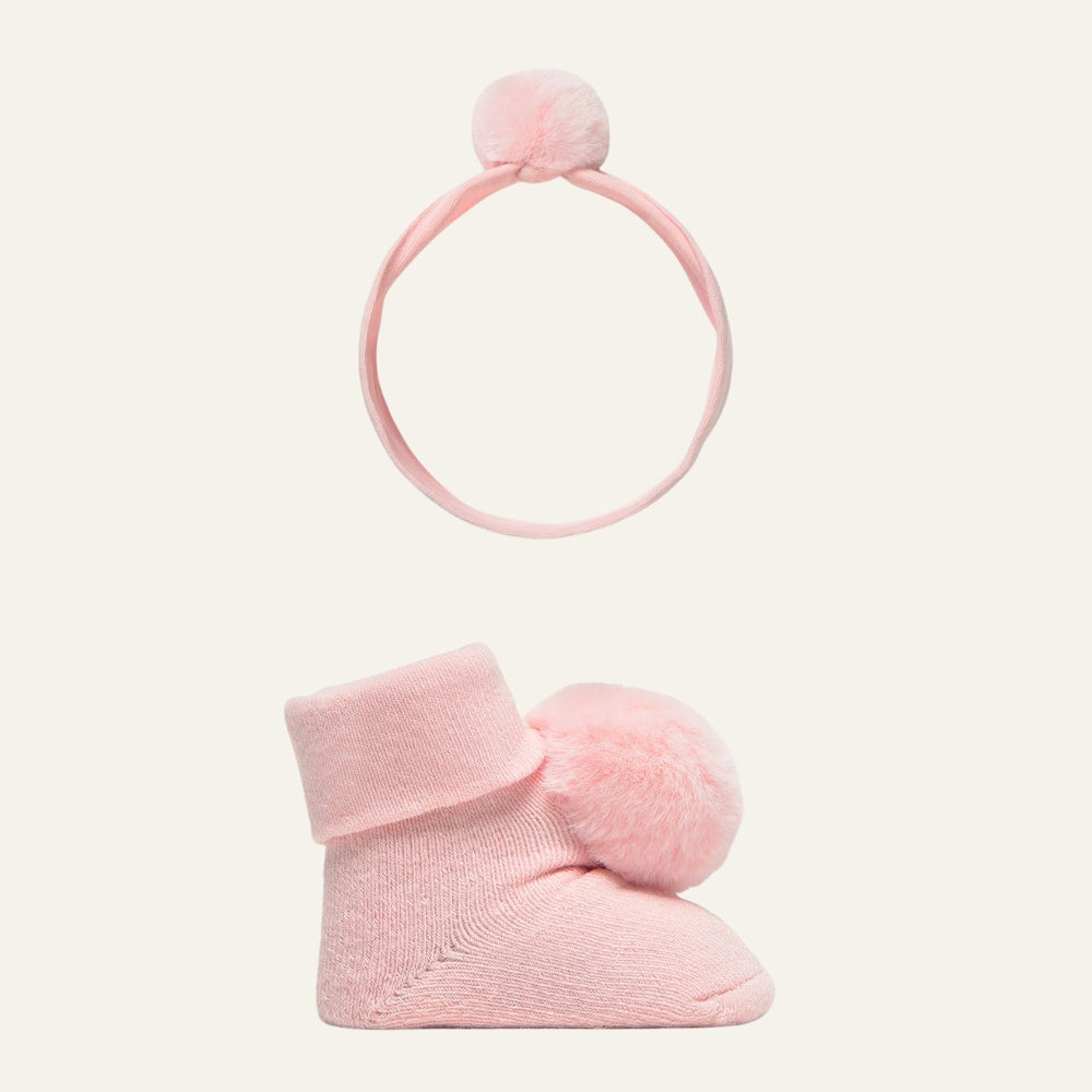 Ponožky a čelenka pre novorodencov majú rozkošné bambuľky a jemné lemovanie, takže súprava je vhodná na každodenné nosenie, ako aj na špeciálne príležitosti alebo rodinné fotografie.