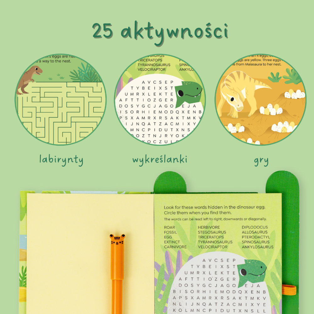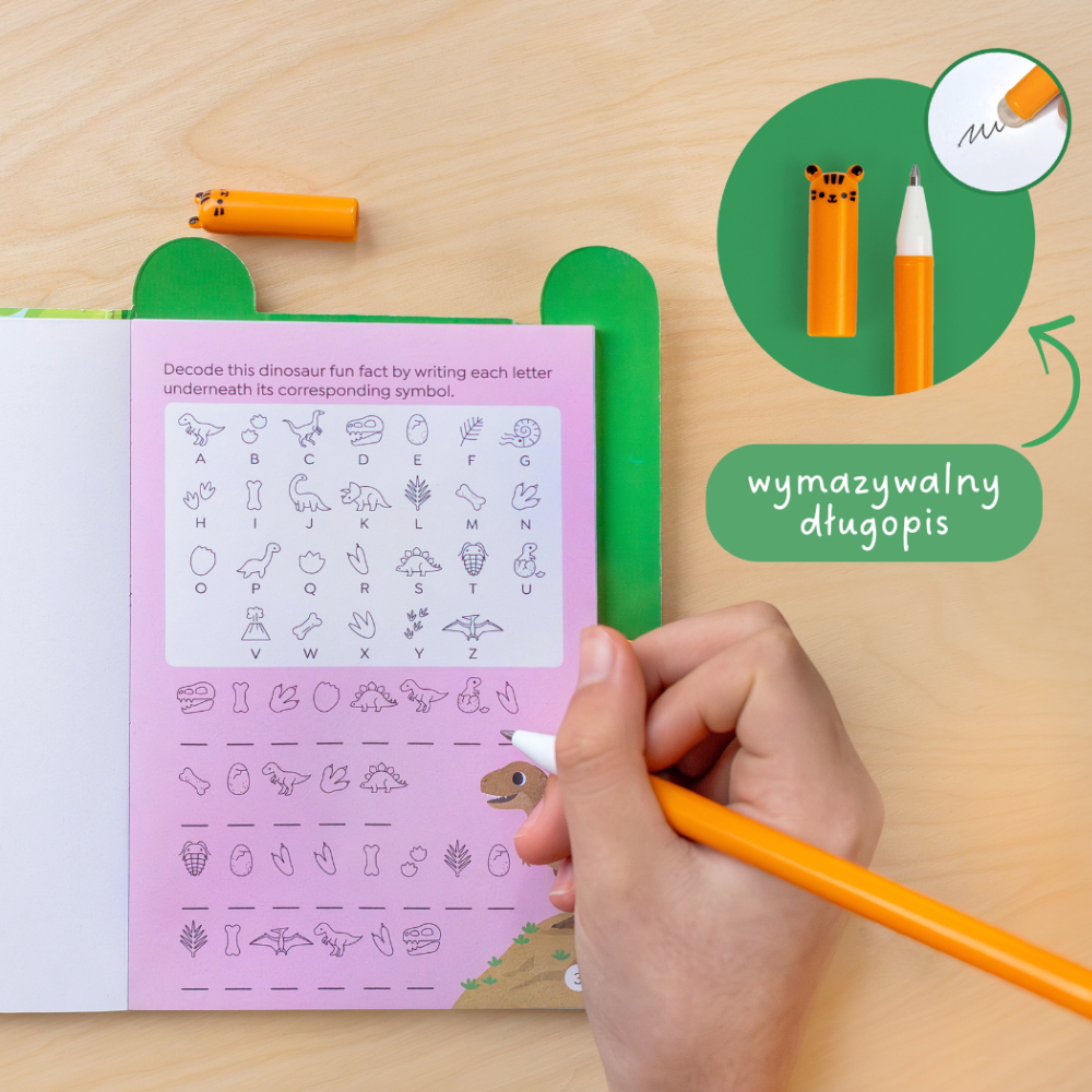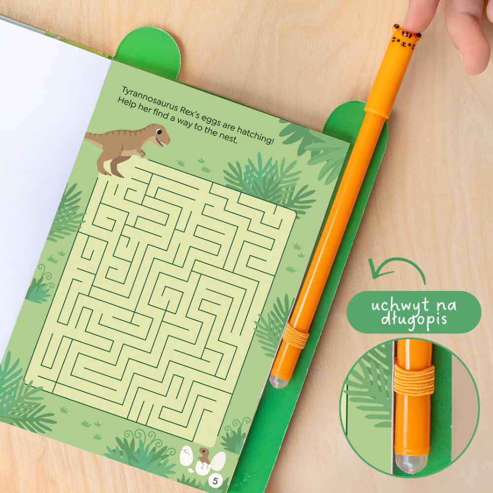 Vnútri na vás čakajú bludiská, hádanky, slovné hry a logické hádanky - všetko na jednom mieste, v téme obľúbených dinosaurov.