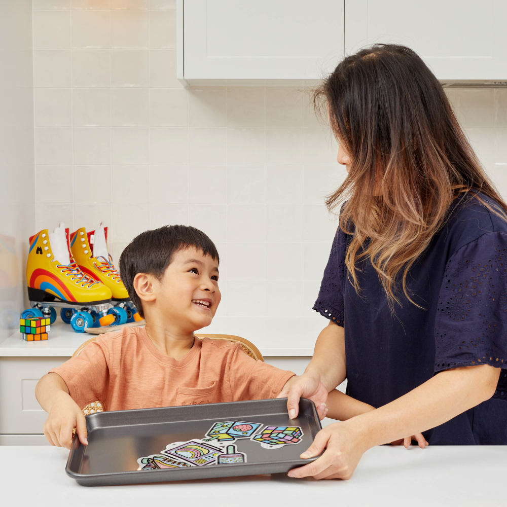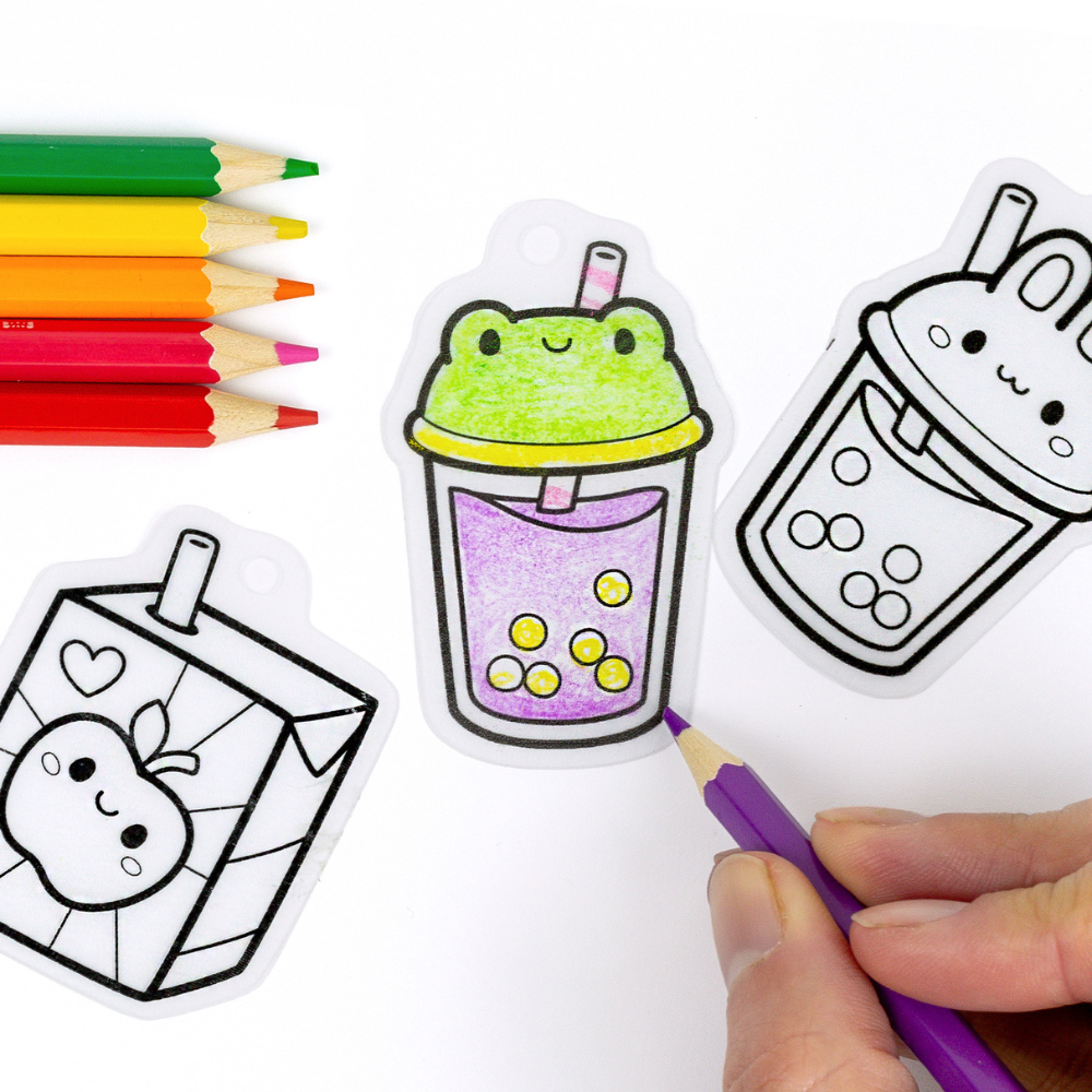 Stačí len vyfarbiť ilustrované predrezané vzory, vložiť ich do rúry a sledovať, ako sa zmršťujú na približne 40 % pôvodnej veľkosti a farby sa stávajú intenzívnejšími - skutočné domáce kúzlo.