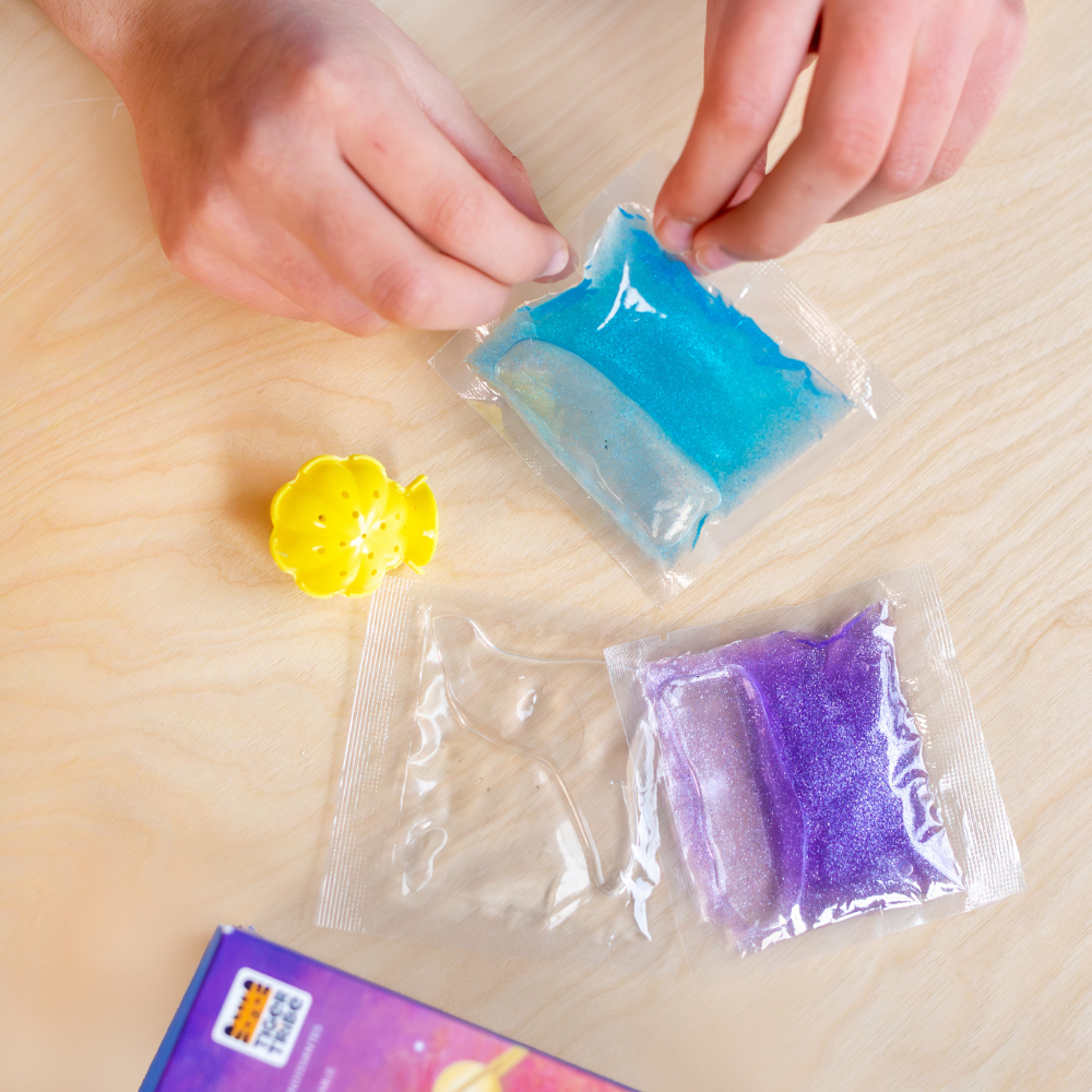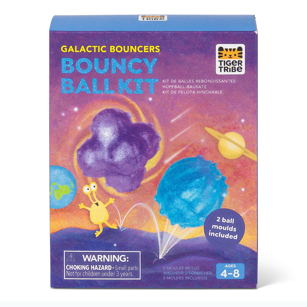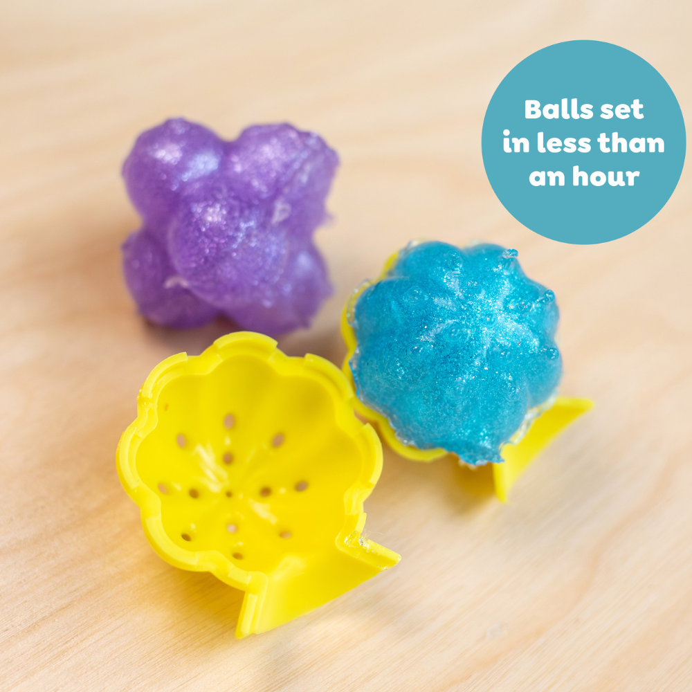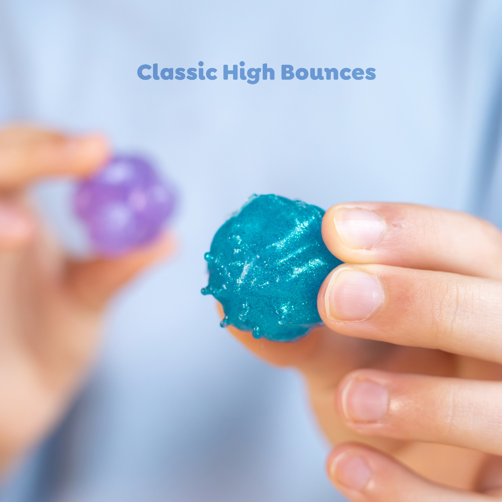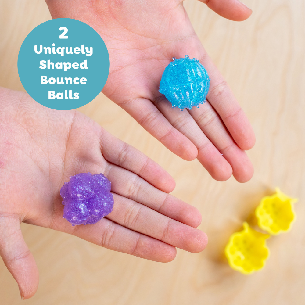 Táto kreatívna súprava vyzýva deti, aby vytvorili dve lesklé lopty: jednu klasickú a jednu s prekvapivou skákacou dráhou.