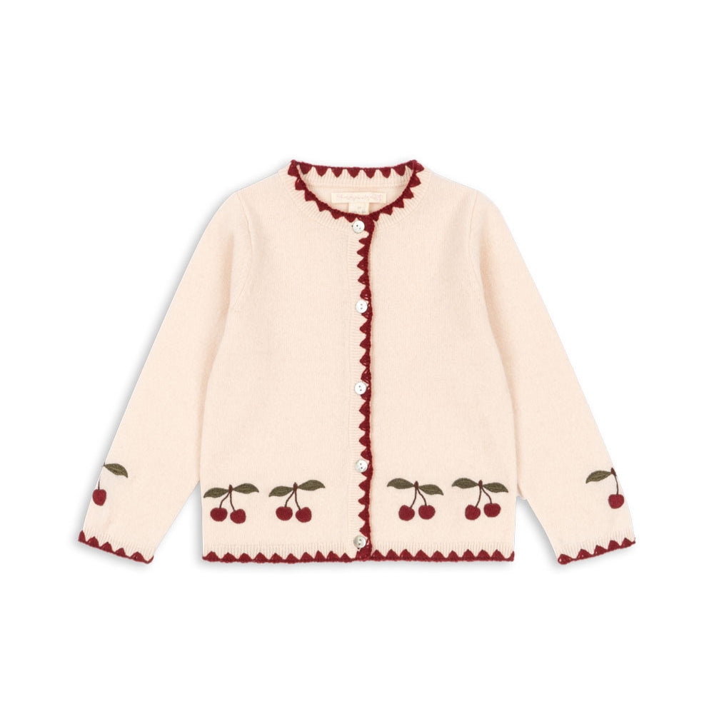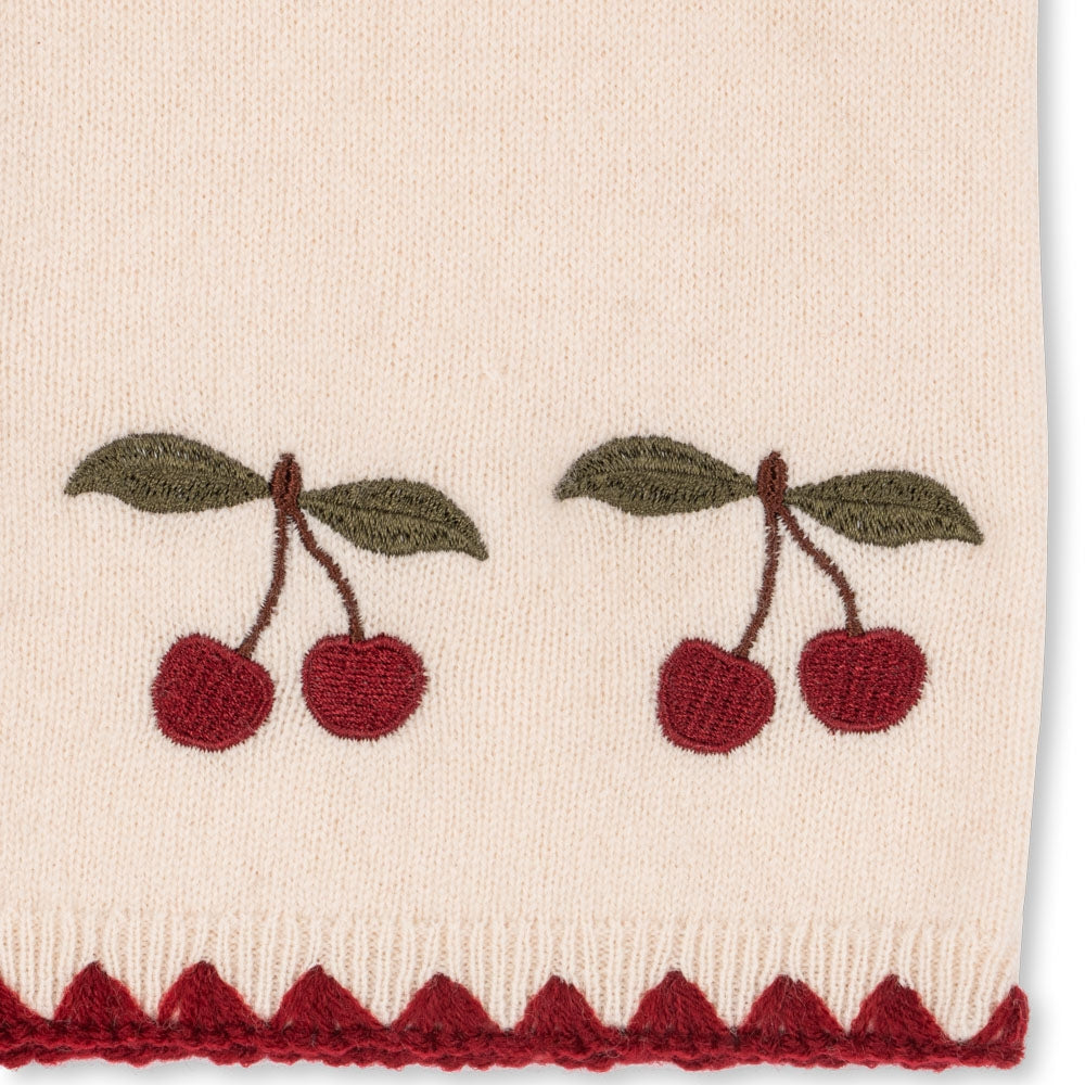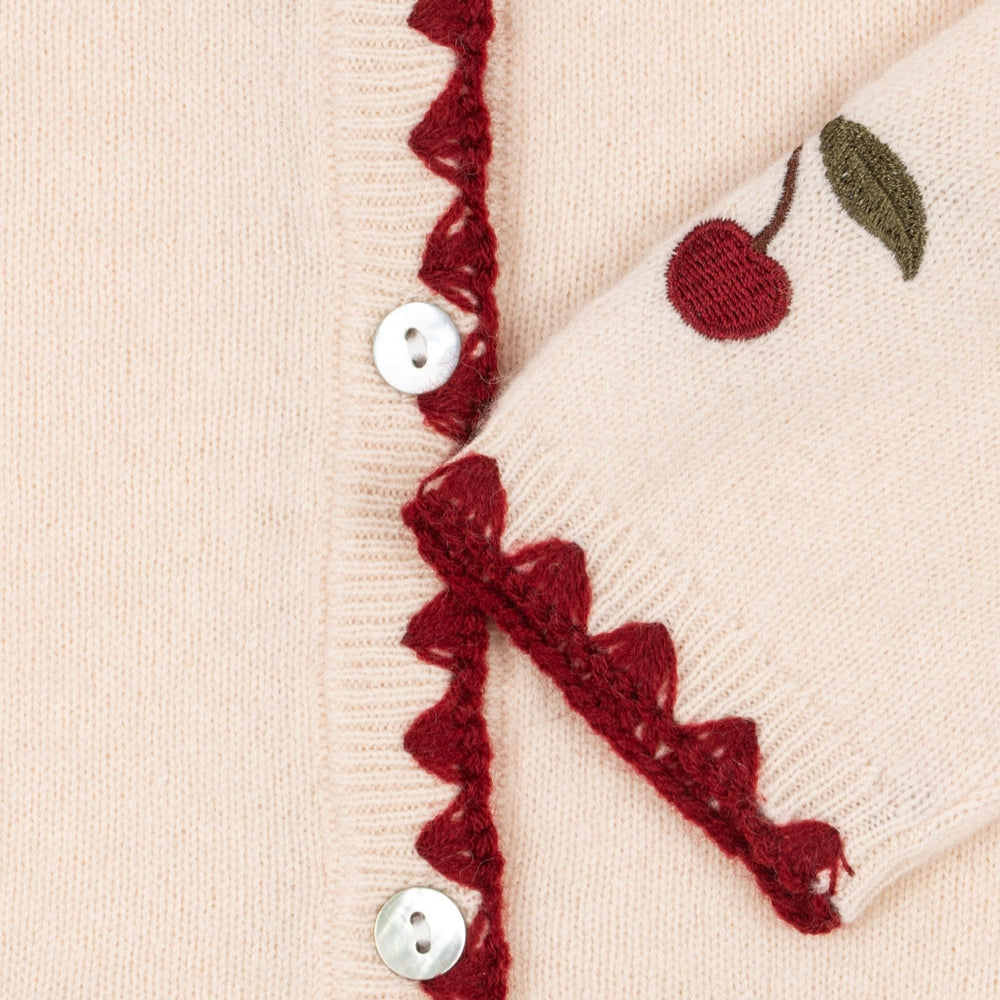 Jemná výšivka v tvare čerešne a kontrastné lemy mu dodávajú osobitý šarm, zatiaľ čo perleťové zapínanie na gombíky mu dodáva elegantný nádych.