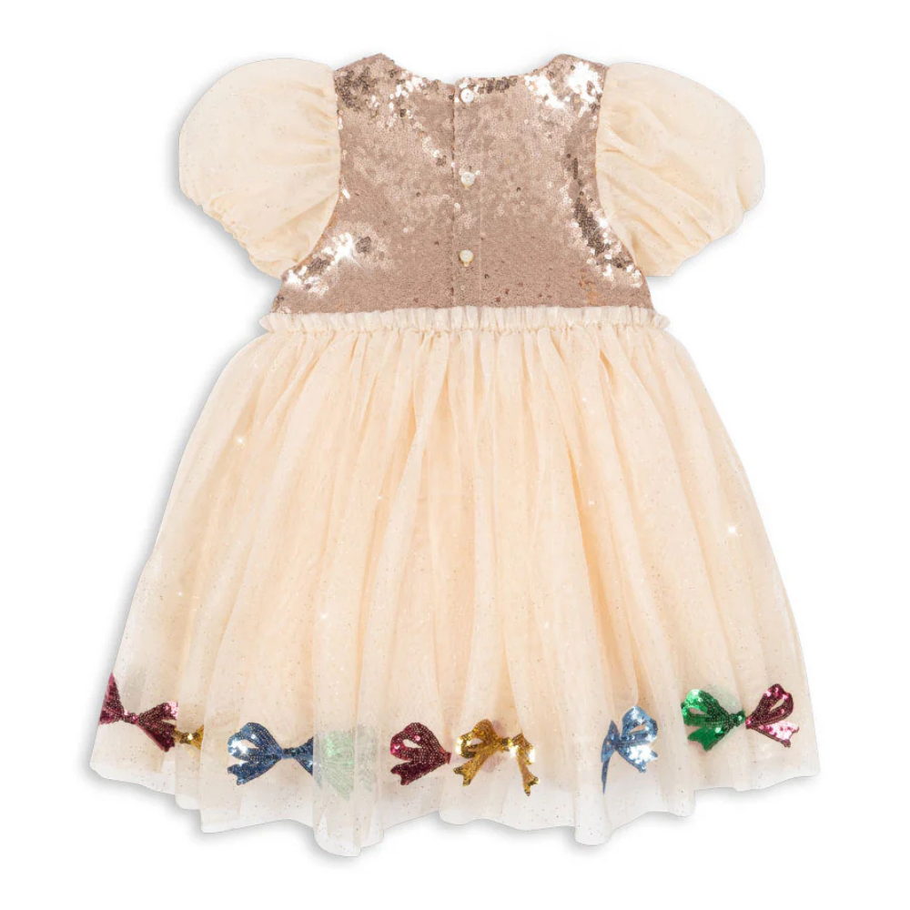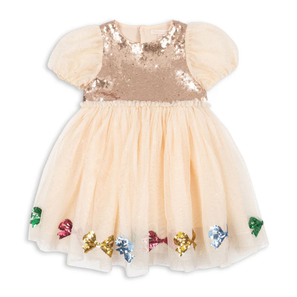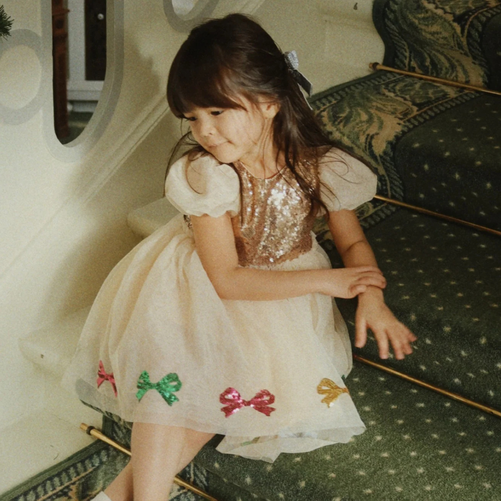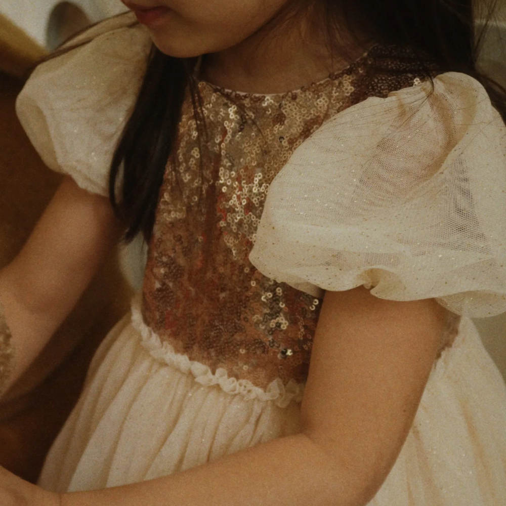 Tento elegantný dizajn kombinuje očarujúce trblietanie s ľahkým, rozprávkovým spodným dielom - ideálny na oslavy, sviatky a rodinné fotografie.