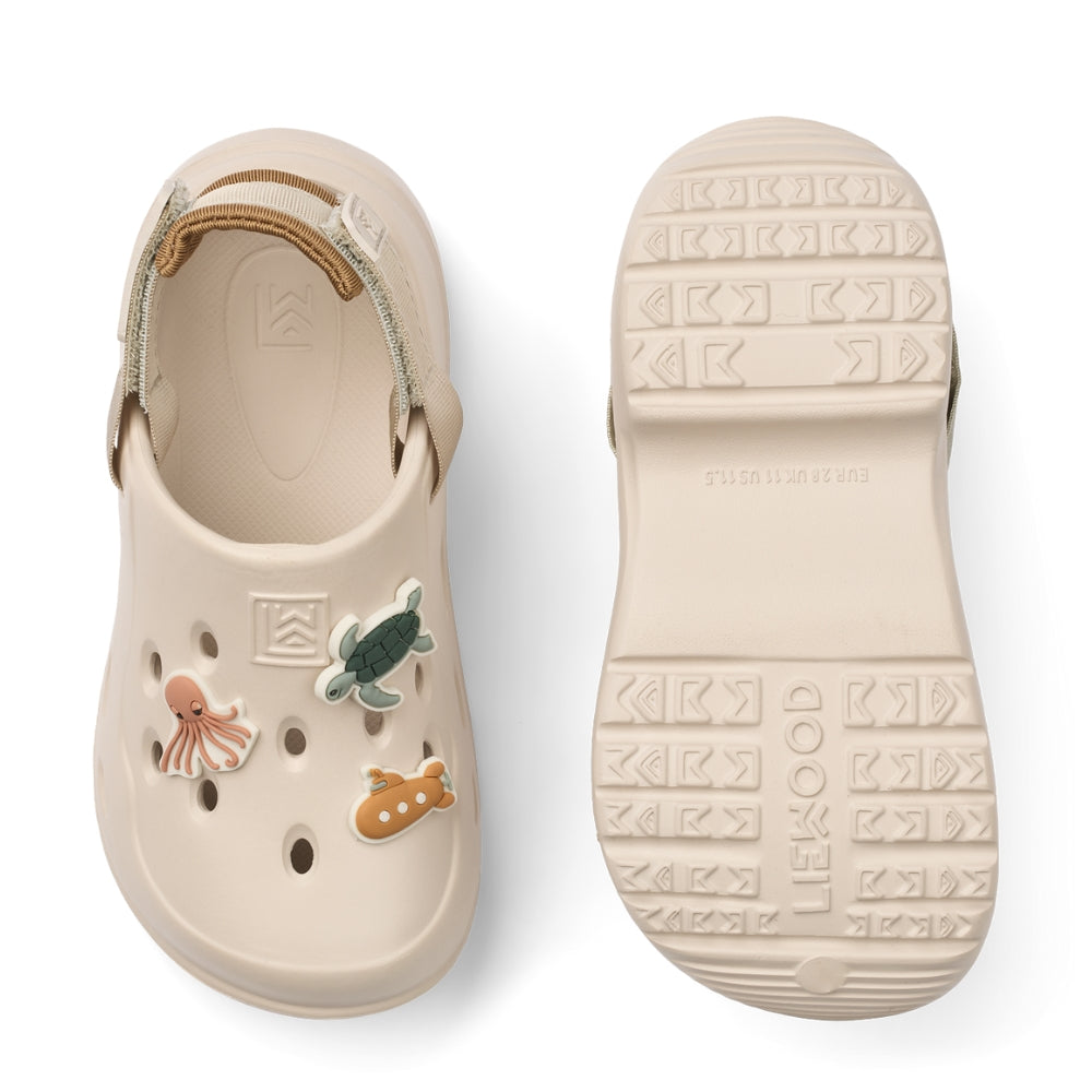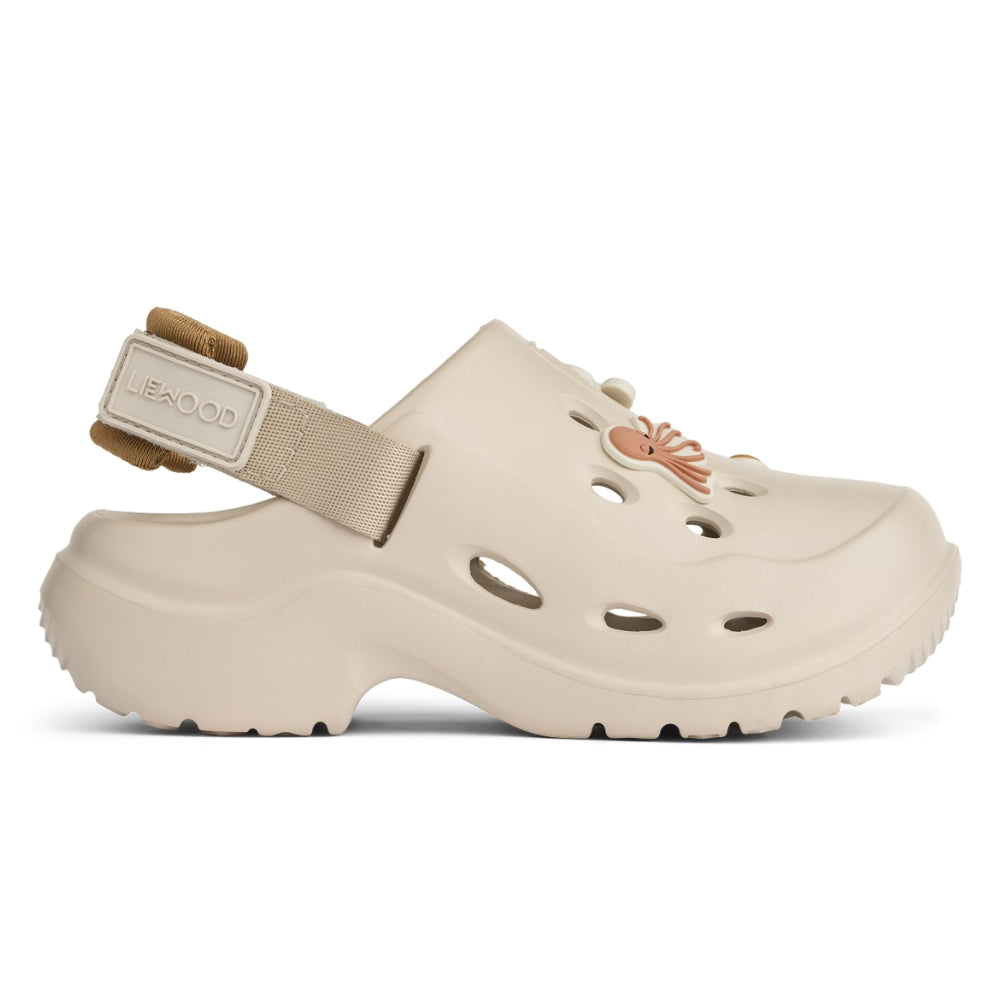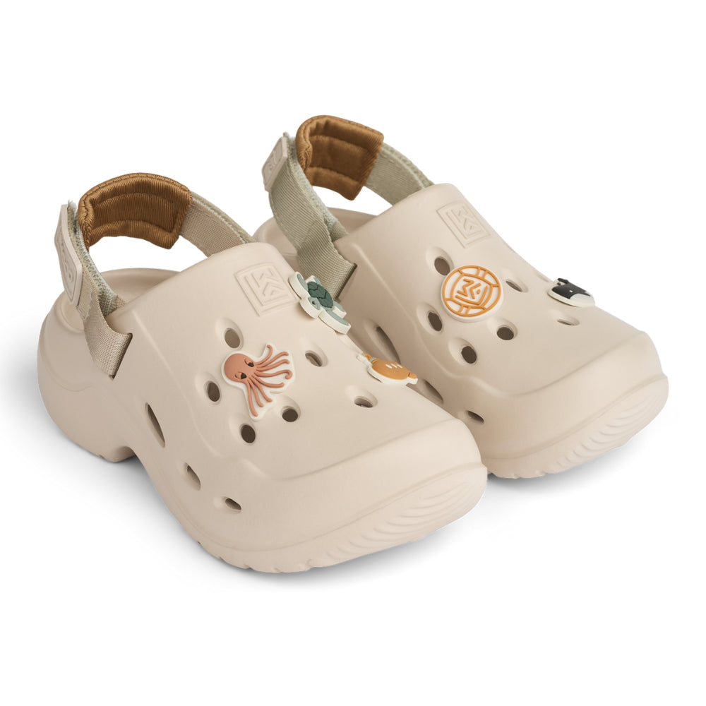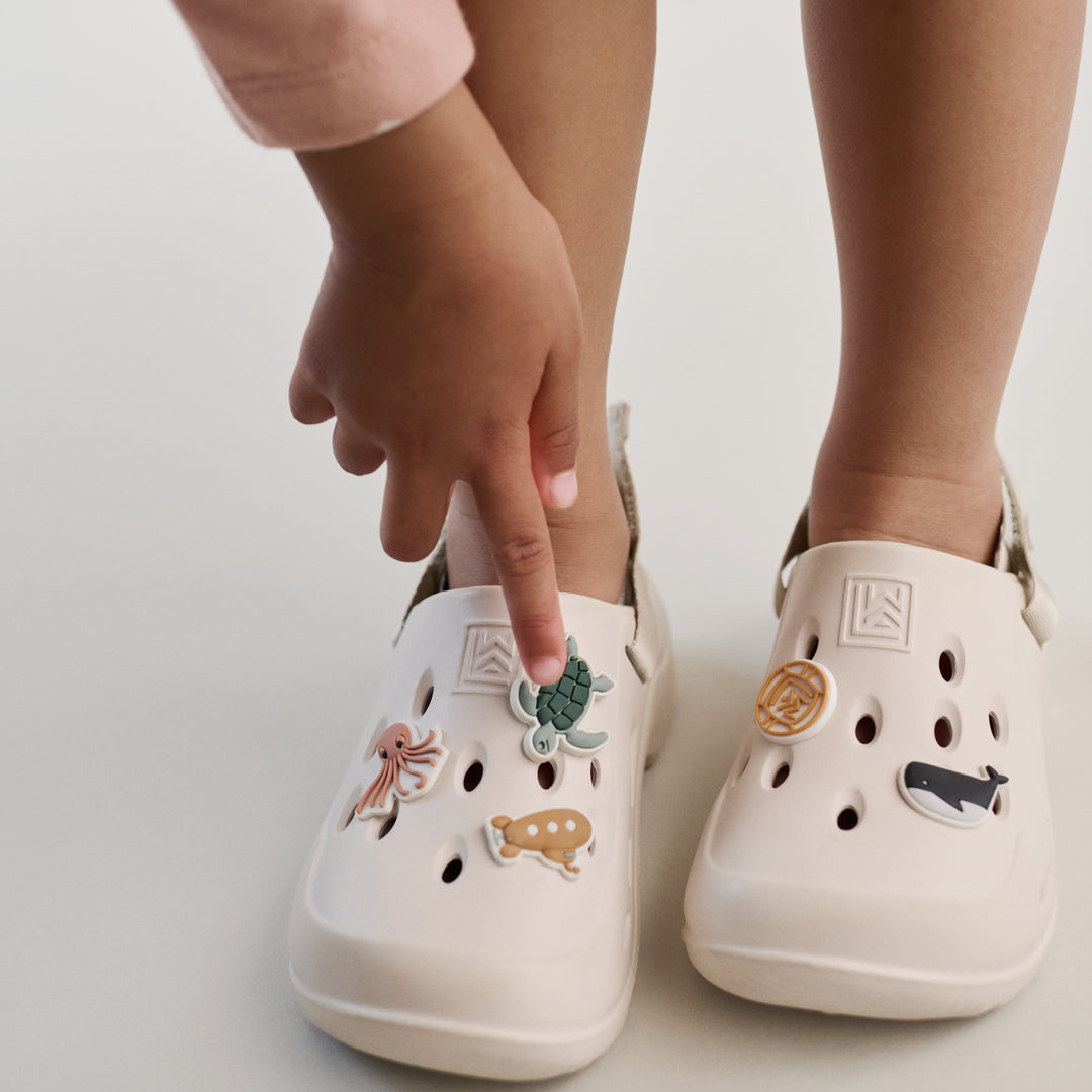 Model je vybavený zábavnými, farebnými príveskami v charakteristických tvaroch značky Liewood, ktoré si môžu deti prestavať a prispôsobiť svojmu štýlu. Nastaviteľný pásik na päte uľahčuje dokonalé prispôsobenie, zatiaľ čo mäkká, polstrovaná stielka v oblasti päty zvyšuje pohodlie.