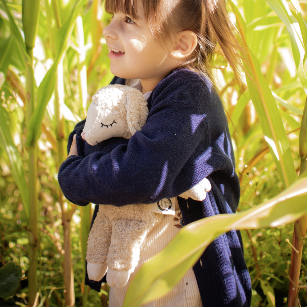 Je vyrobený z organickej bavlny s certifikátom GOTS a vyplnený čistou ovčou vlnou a ukrýva odnímateľný vankúšik z hroznových jadierok, ktorý poskytuje jemné, prirodzené teplo.
