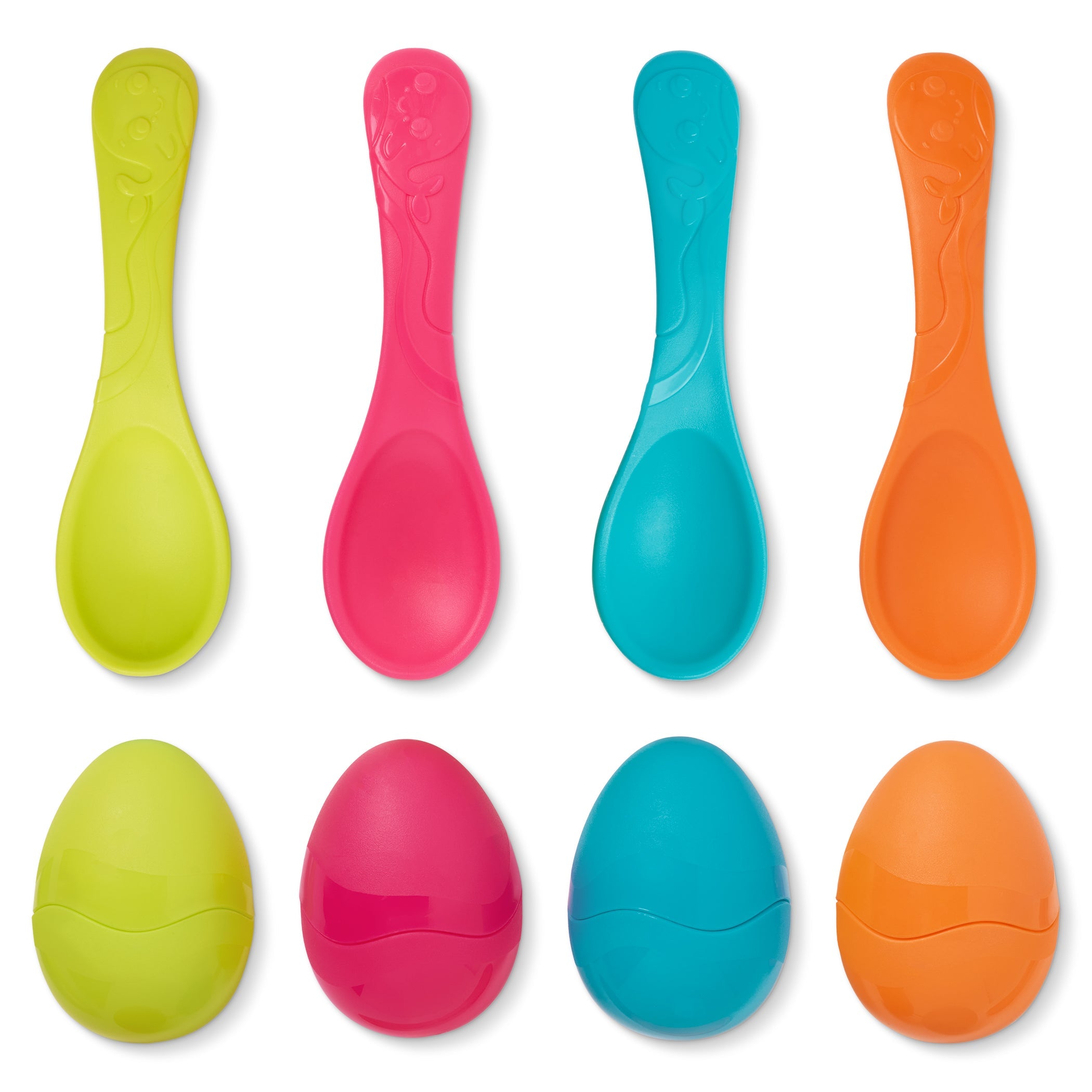 Súprava obsahuje štyri ergonomické lyžice so senzorickými hrbolčekmi a štyri vajíčka v rovnakých farbách, každé vajíčko sa skladá z dvoch polovíc, takže do vnútra môžete pridať konfety alebo malé prekvapenie (nie je súčasťou balenia), aby ste zvýšili vzrušenie.