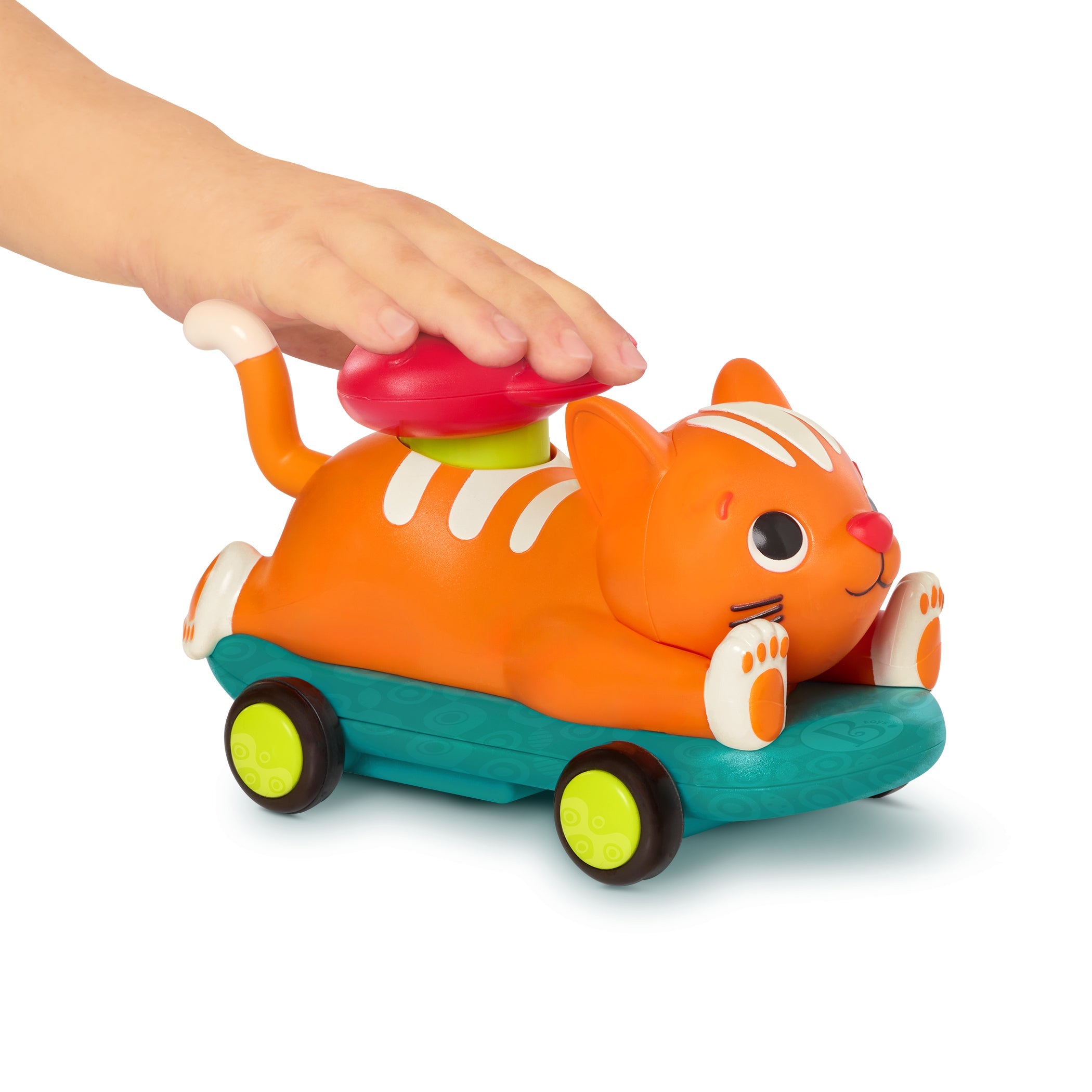 Autíčka B.Toys PawMobiles Push&,Go sú duo plné energie: stačí stlačiť vozidlo zhora a psík a mačička sa vydajú na cestu a vrtia chvostíkmi.