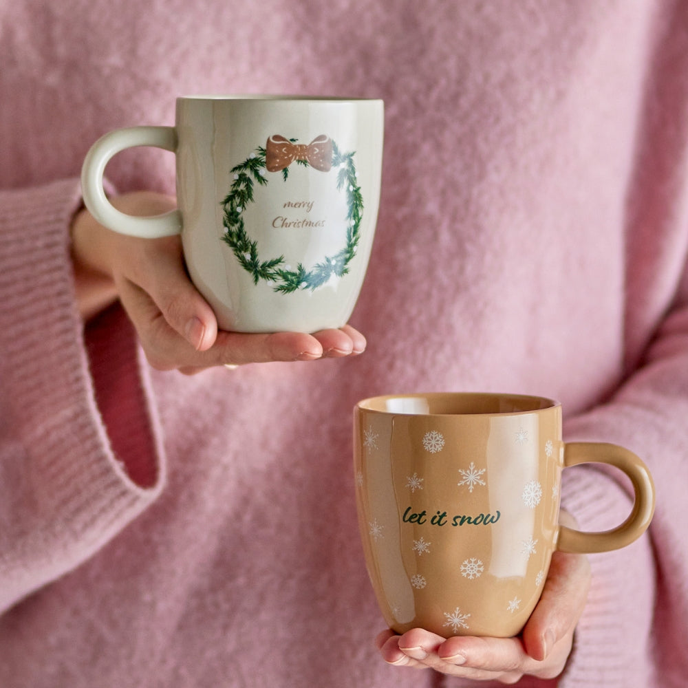 Súprava obsahuje dva kameninové hrnčeky na kávu zdobené rozkošnými motívmi - na jednom sú slová "Let it snow" (Nech sneží) obklopené snehovými vločkami a na druhom klasický veniec s nápisom "Merry Christmas" (Veselé Vianoce).