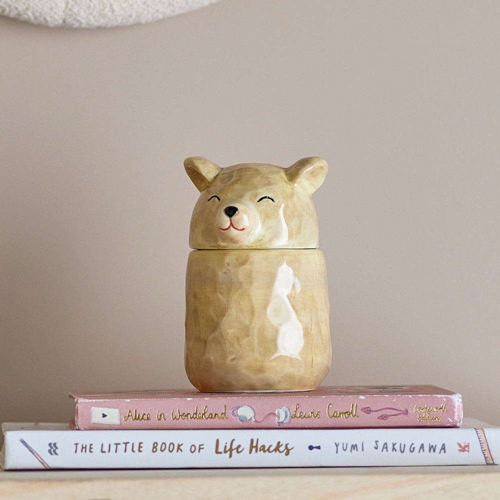 Bloomingville MINI Puk Jar s vekom v sivej farbe je krásny doplnok, ktorý zútulní detskú izbu a pomôže usporiadať drobnosti.