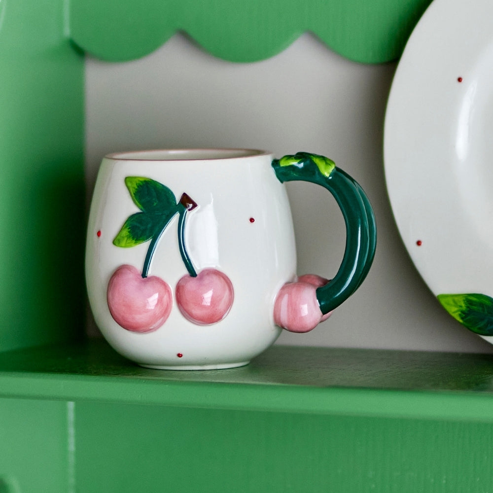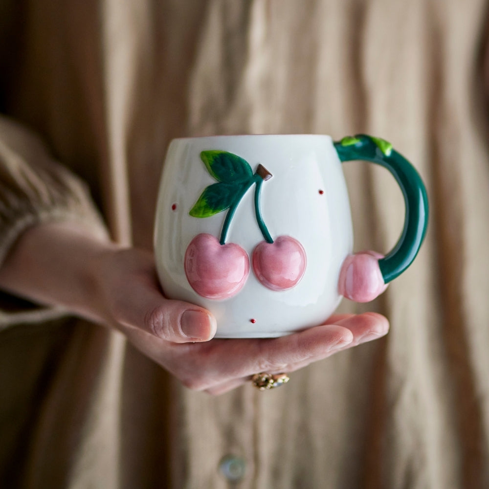 Tento jedinečný kameninový hrnček zaujme zaobleným tvarom, krémovým povrchom a ručne maľovaným motívom ružových čerešní.
