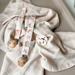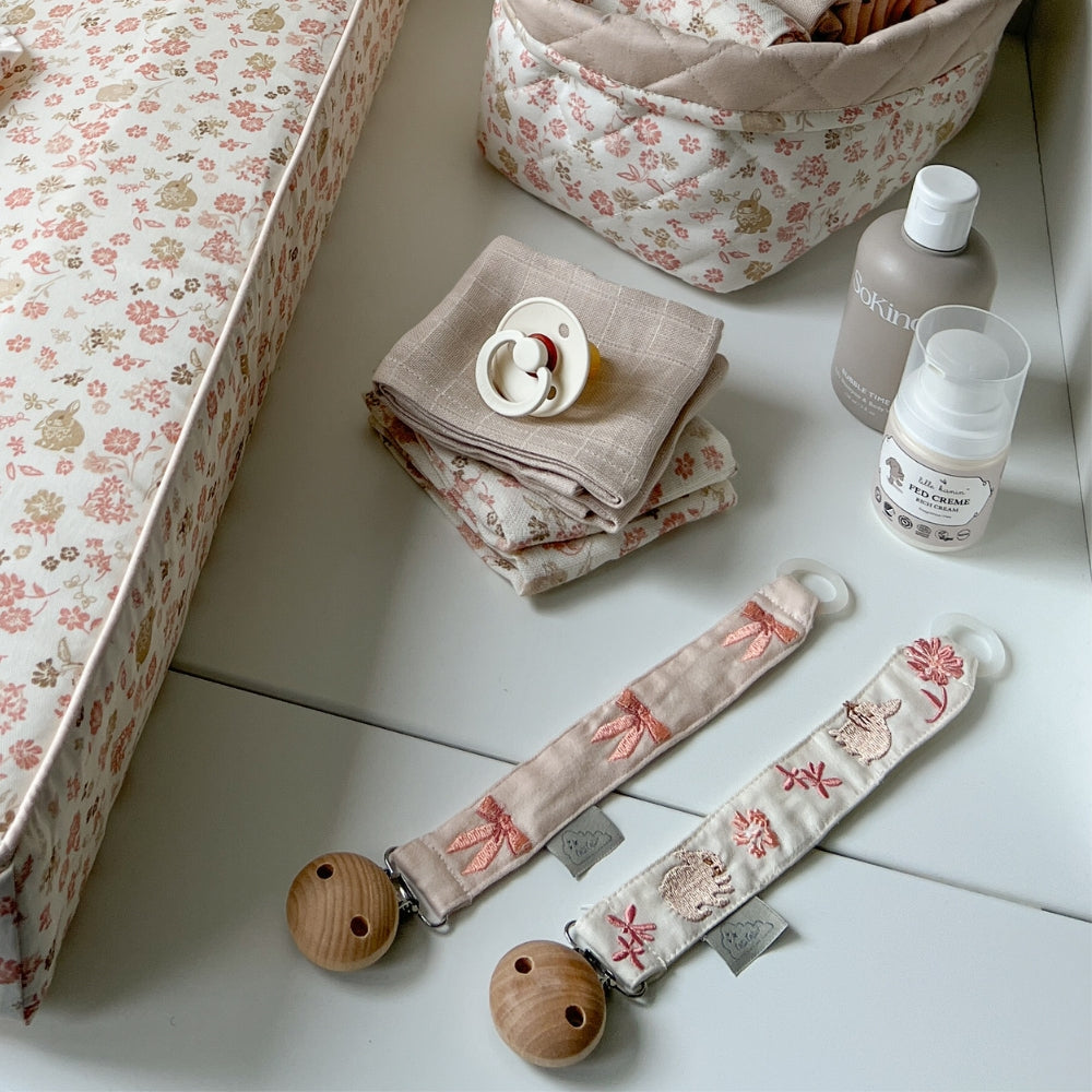 Elegantný klip z prírodného dreva a kovu bez obsahu niklu umožňuje bezpečné pripevnenie prívesku na cumlík k oblečeniu dieťaťa, čím chráni cumlík pred pádom a zašpinením.