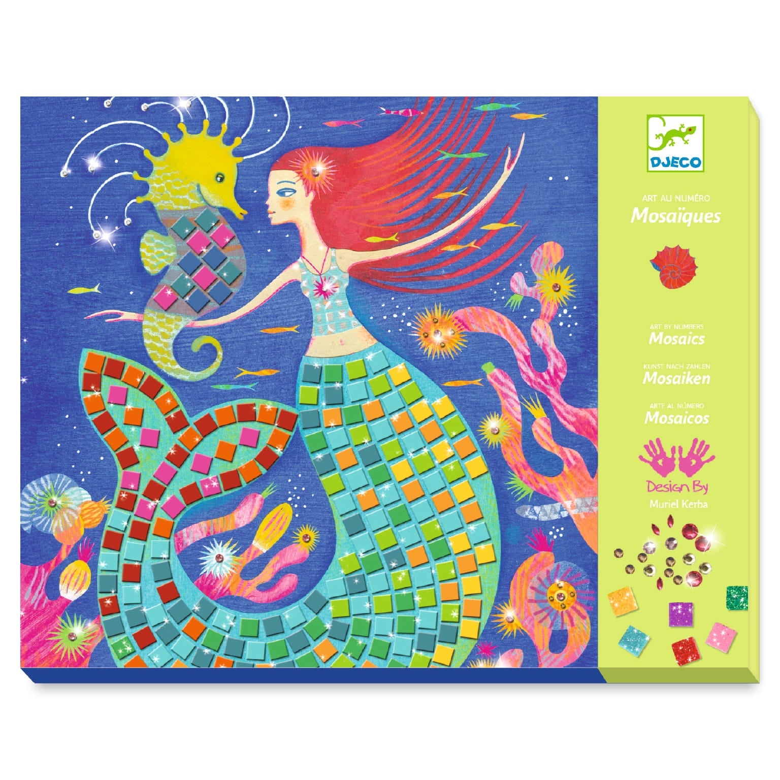 So sadou Djeco dieťa krok za krokom vytvára žiarivé ilustrácie morských panien, pričom lepí farebné penové mozaiky a zirkóny podľa čísel uvedených na tabuľkách.