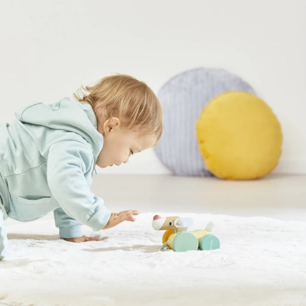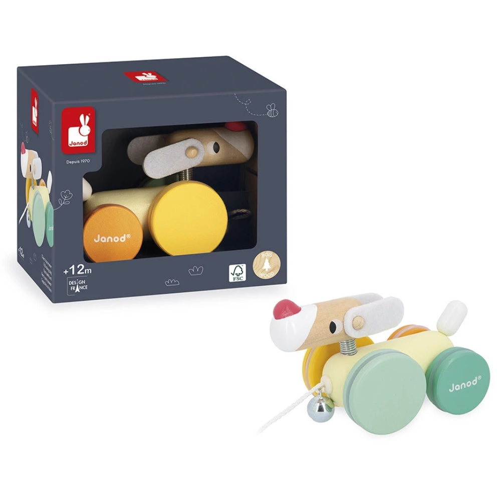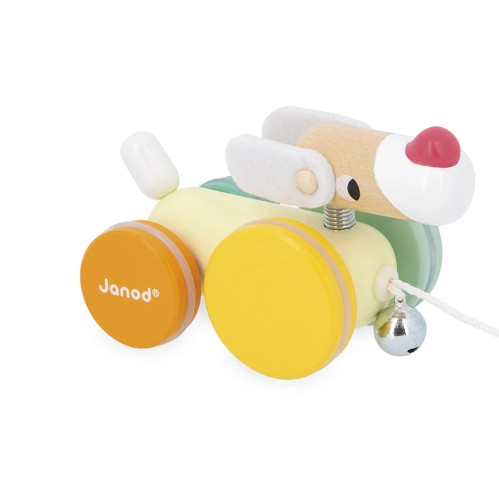 Hračka na ťahanie Janod je rozkošný farebný psík na kolieskach, ktorý sa rýchlo stáva obľúbeným spoločníkom na malých prechádzkach.
