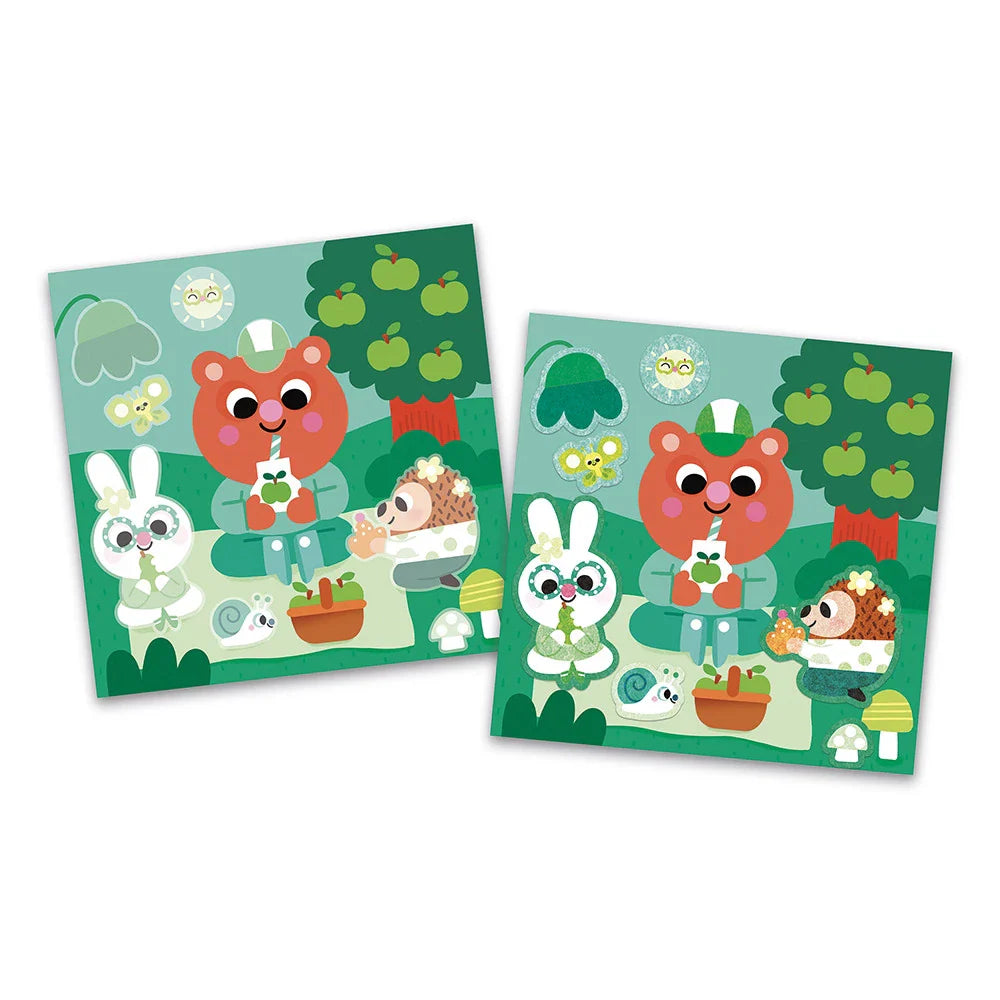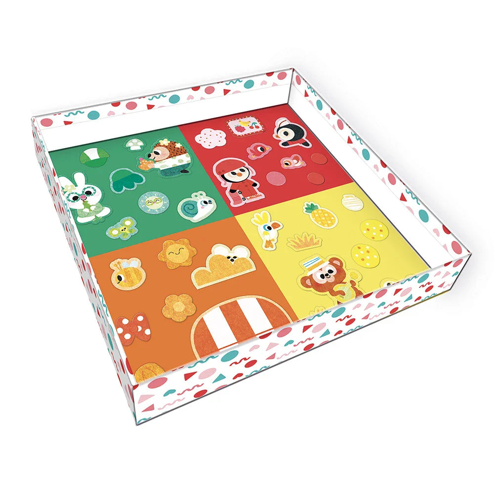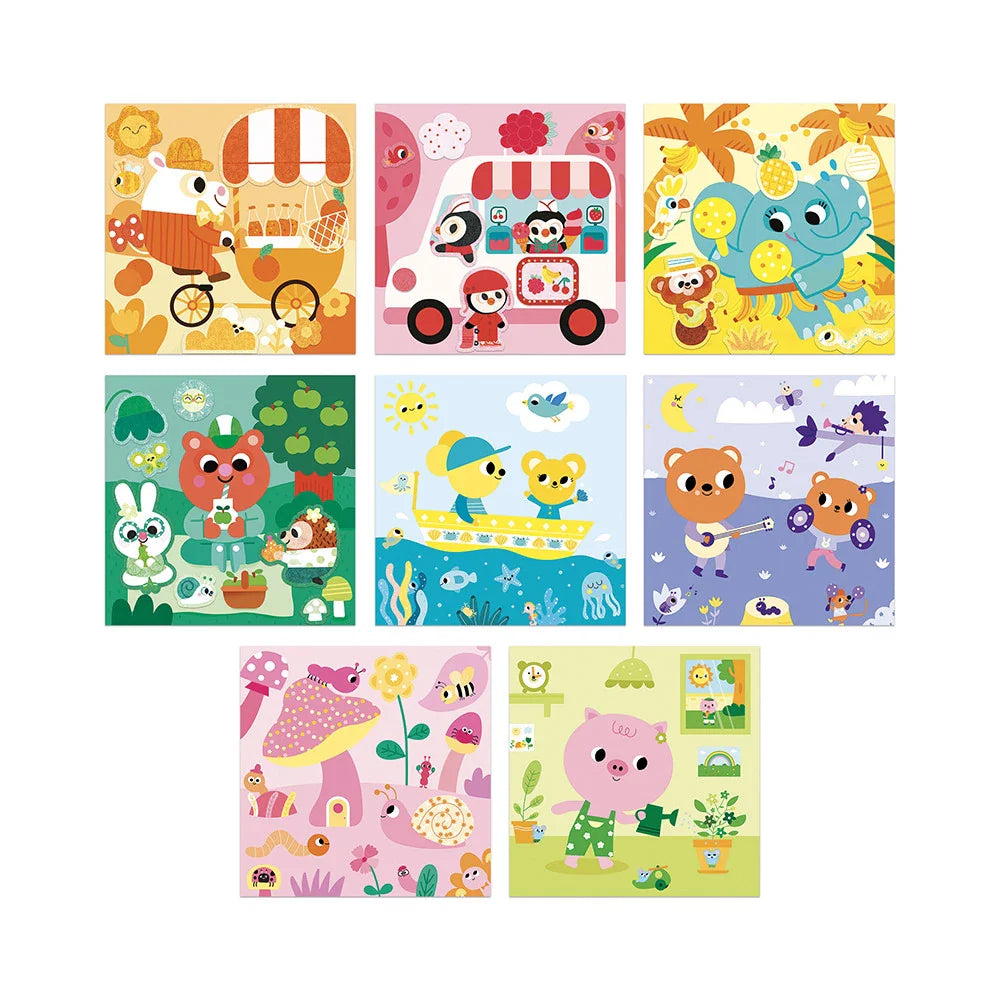 S touto kreatívnou súpravou Janod môžu batoľatá ozdobiť štyri obrázky pomocou okrúhlych penových mozaiiek a vytvoriť tak výrazné a farebné ilustrácie.