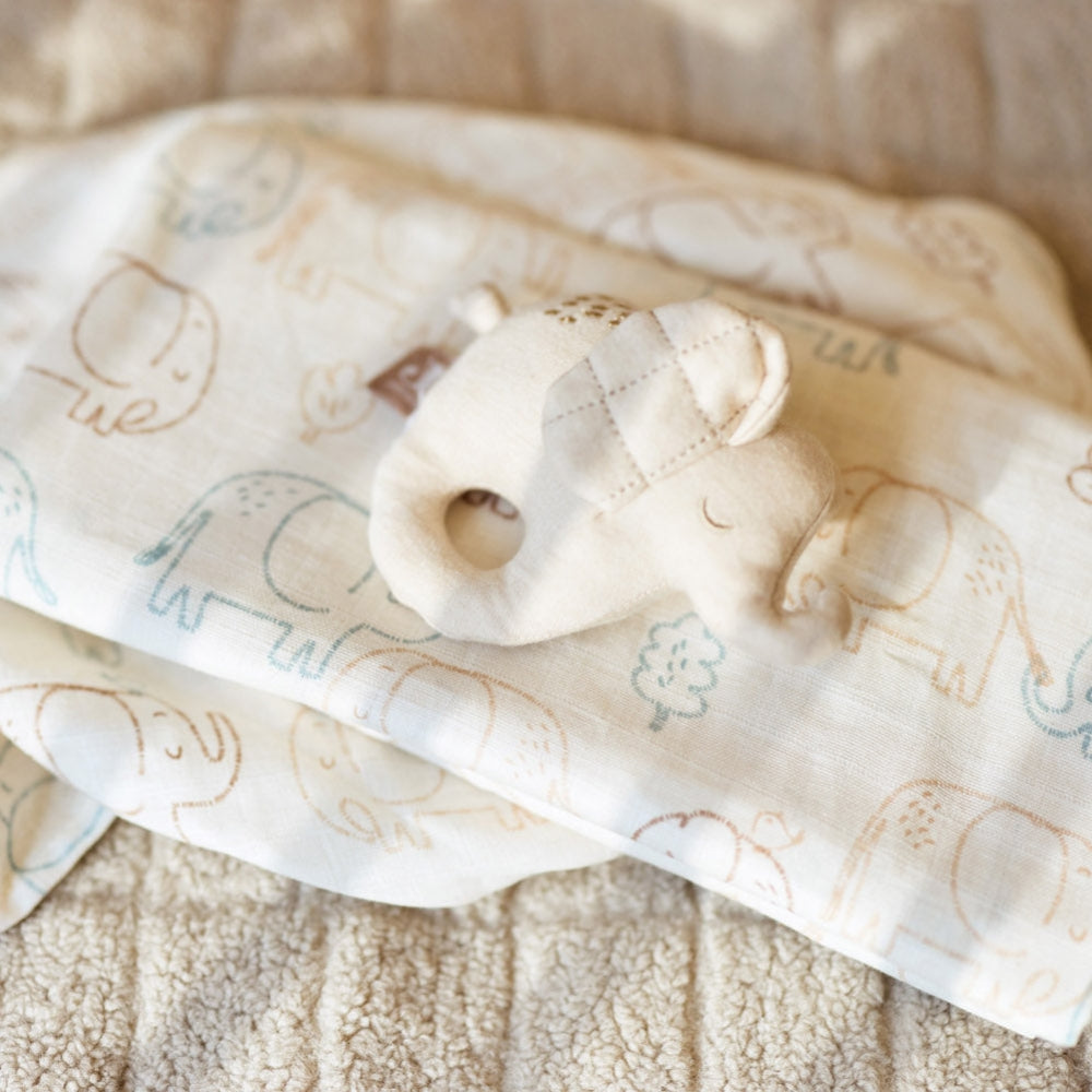 Rozkošný vzor Elephant Tales s malými sloníkmi dodáva celej súprave mimoriadne jemný a detský charakter, typický pre výrobky Jollein.