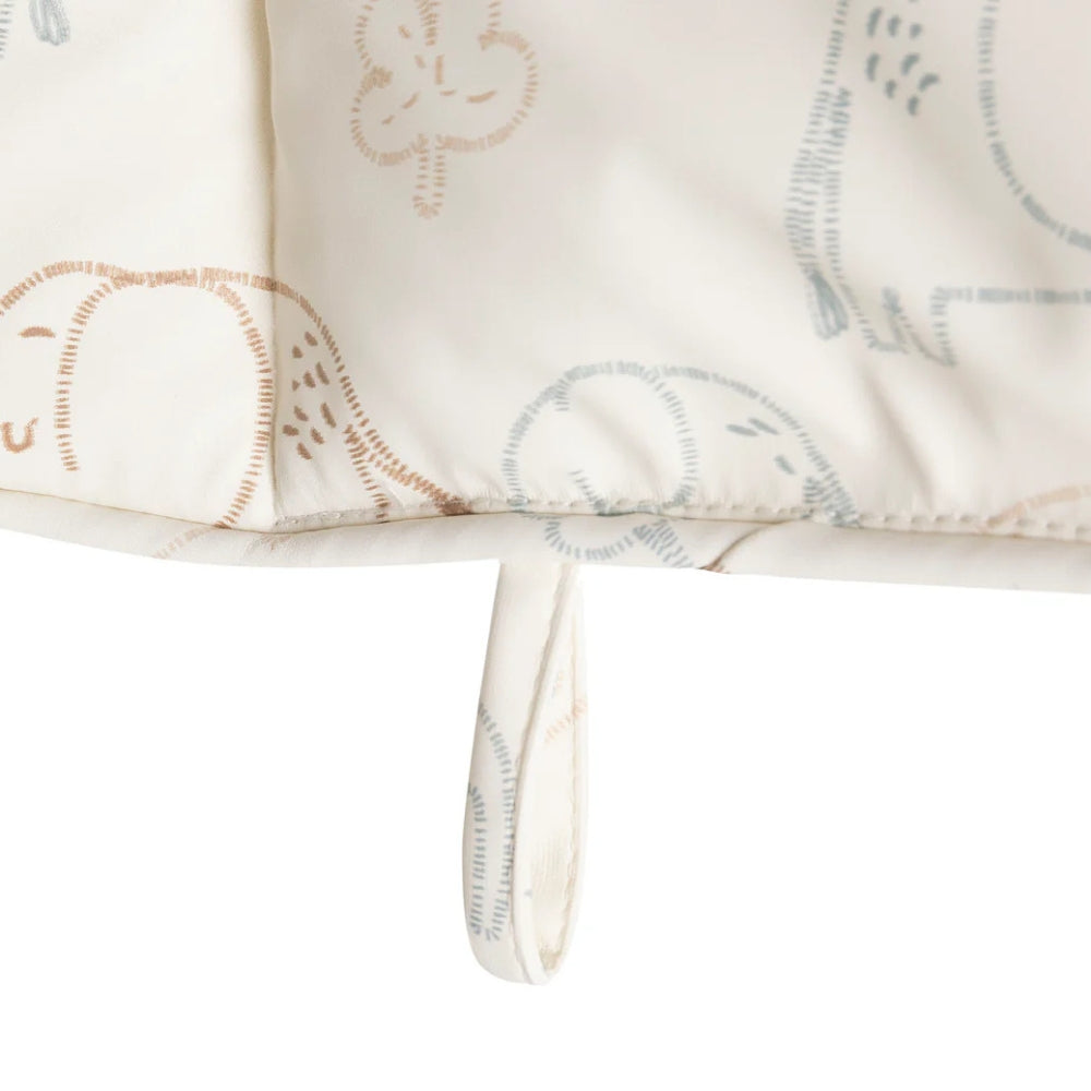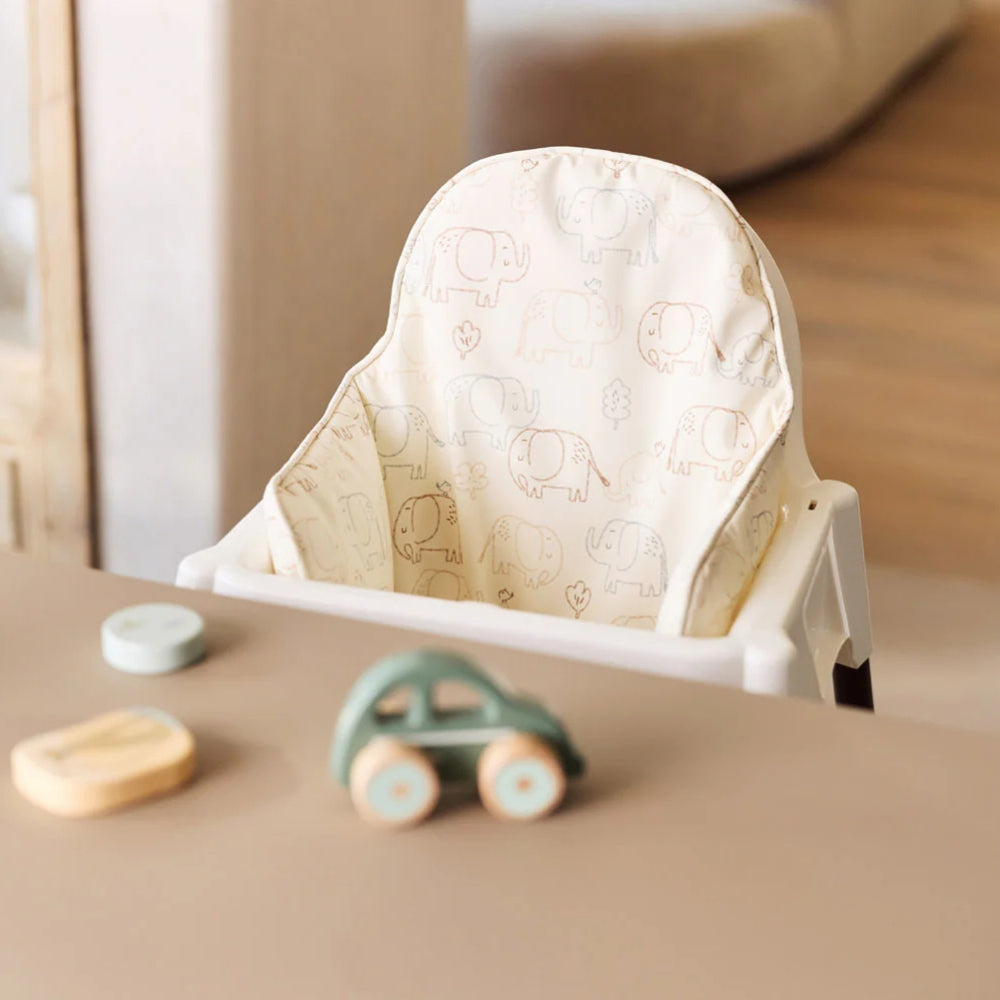 Vankúšik na stoličku na kŕmenie od spoločnosti Jollein s rozkošnou potlačou Sloní príbehy zvyšuje pohodlie sedadla počas jedla.