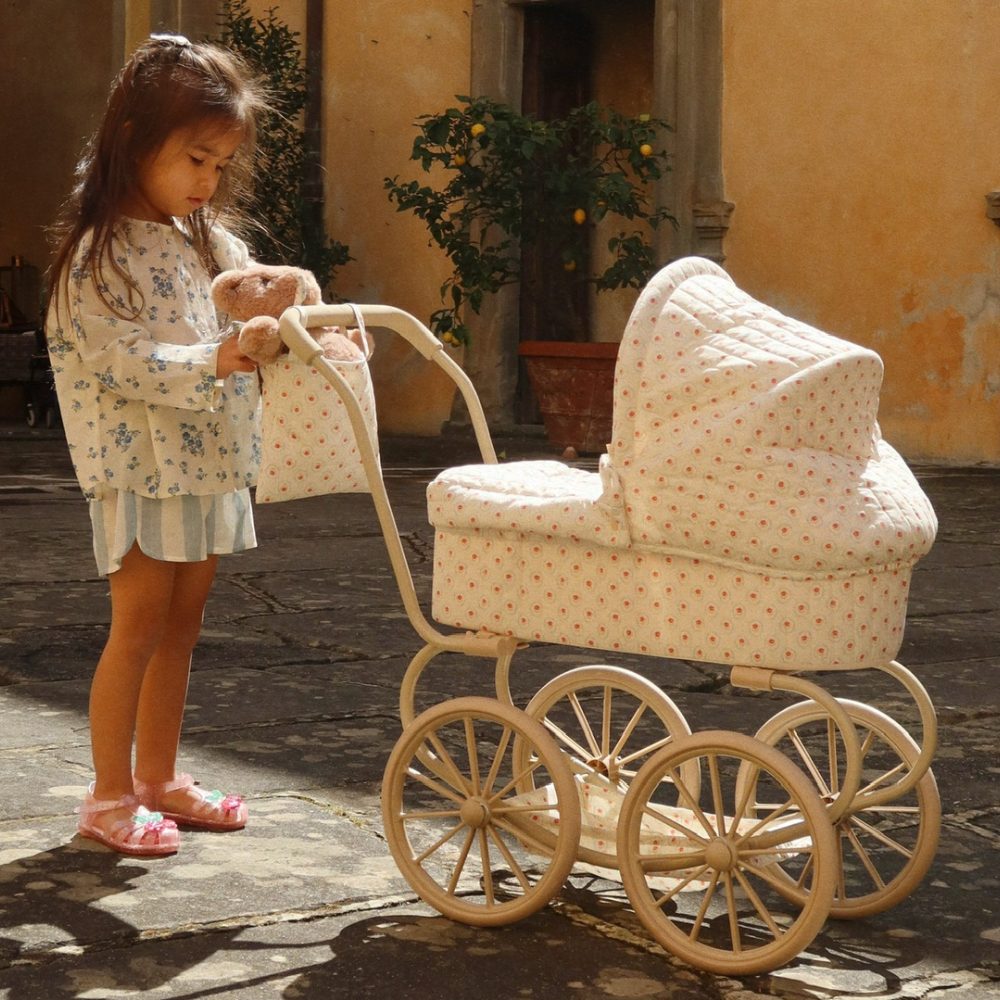Kočík pre bábiky Konges Slojd má sklápaciu striešku, aby vaše dieťa mohlo "chrániť" svoju bábiku pred slnkom, a mäkký košík pod ňou na drobnosti. Celý je skladací a dodáva sa pripravený na použitie, takže nie je potrebná žiadna montáž - stačí ho rozložiť a hrať sa.