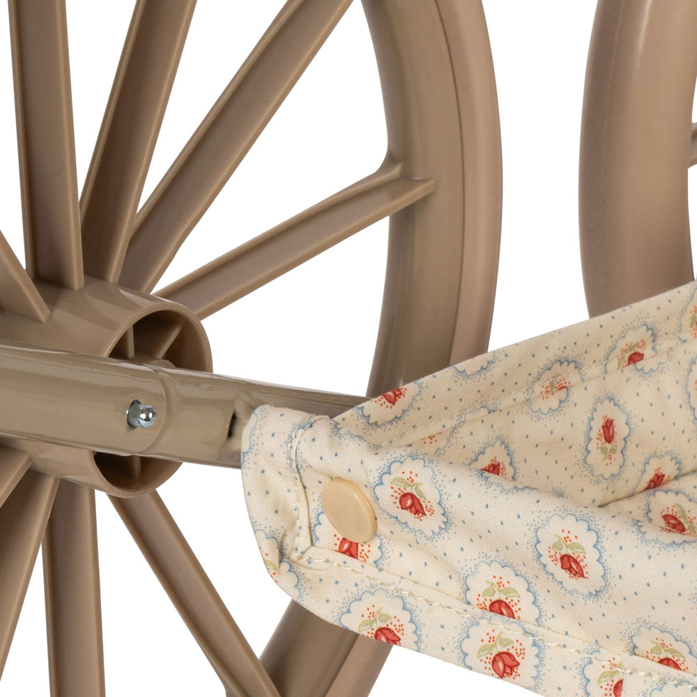 Tento vozík pre bábiky bol navrhnutý tak, aby bol stabilný a ľahko sa riadil - má štyri veľké kolesá, mäkké špongiové rukoväte a pevný kovový rám.