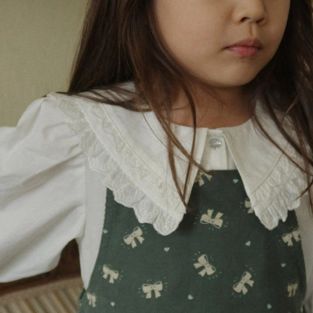 Starostlivo navrhnutý strih s okrúhlym golierom, ozdobnou légou a mierne nariasenými rukávmi dodáva odevu jemný šarm.