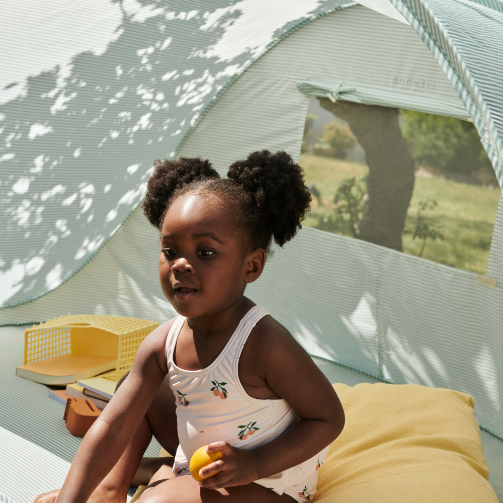 Ľahký a praktický skladací stan Liewood predstavuje rýchly spôsob, ako vytvoriť tieň a bezpečný priestor na hranie vonku.