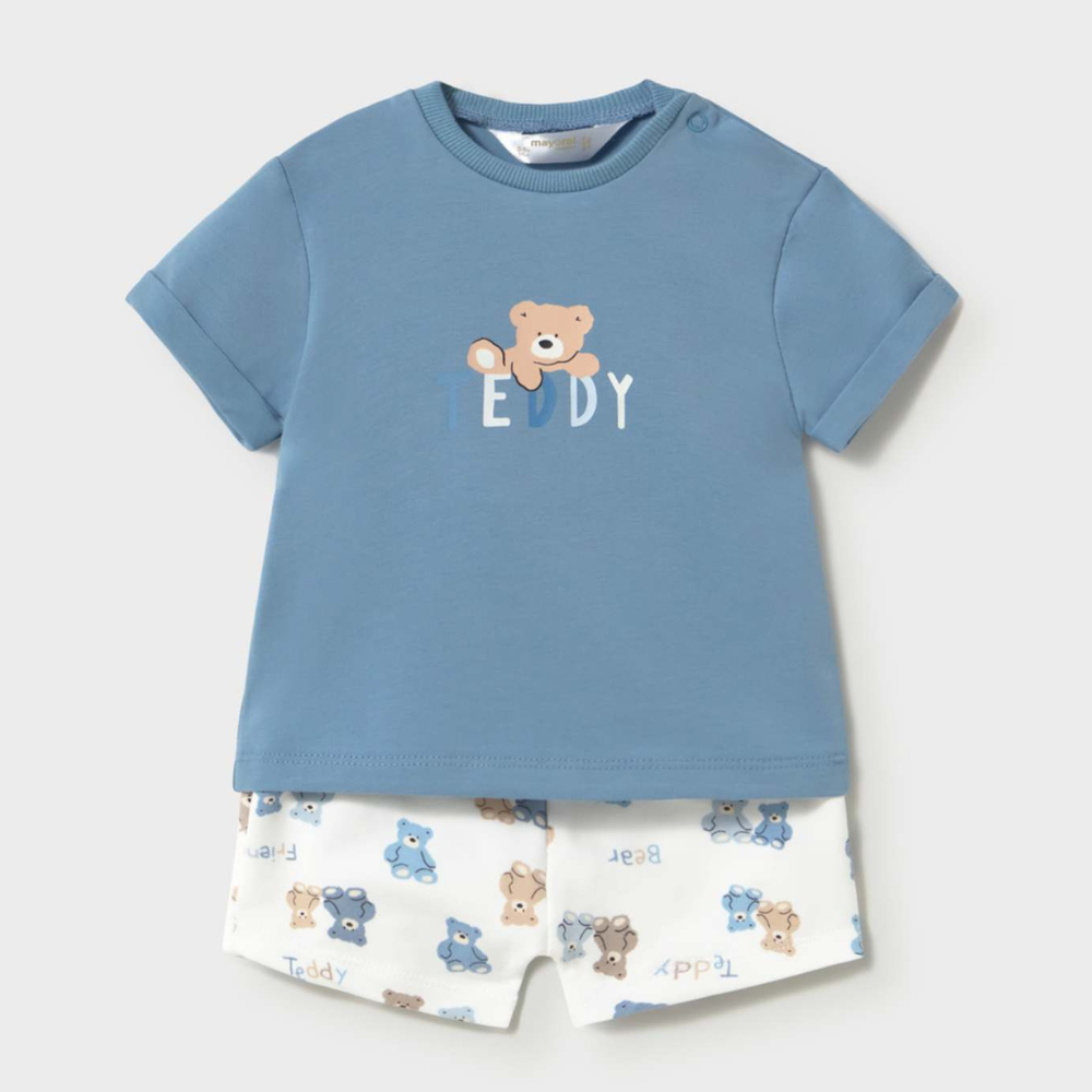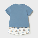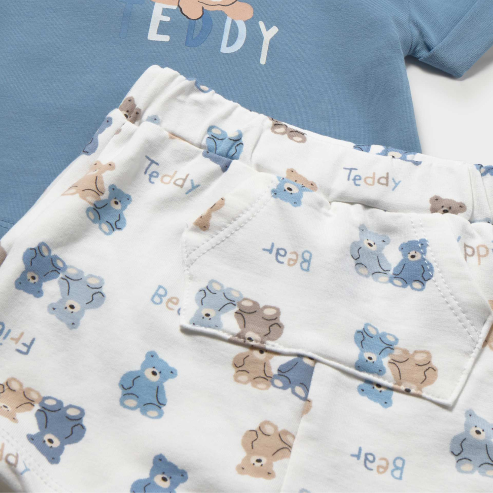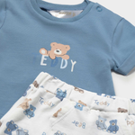 Súprava sa skladá z trička s krátkym rukávom v jemnej modrej farbe a krátkych šortiek vo svetlom odtieni s opakovaným motívom medvedíka.
