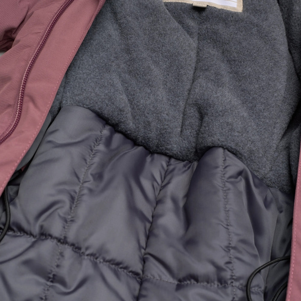 Flísová podšívka v kapucni, hornej časti a na manžetách poskytuje dodatočné teplo, zatiaľ čo klzká taftová podšívka v rukávoch a nohaviciach uľahčuje obliekanie.