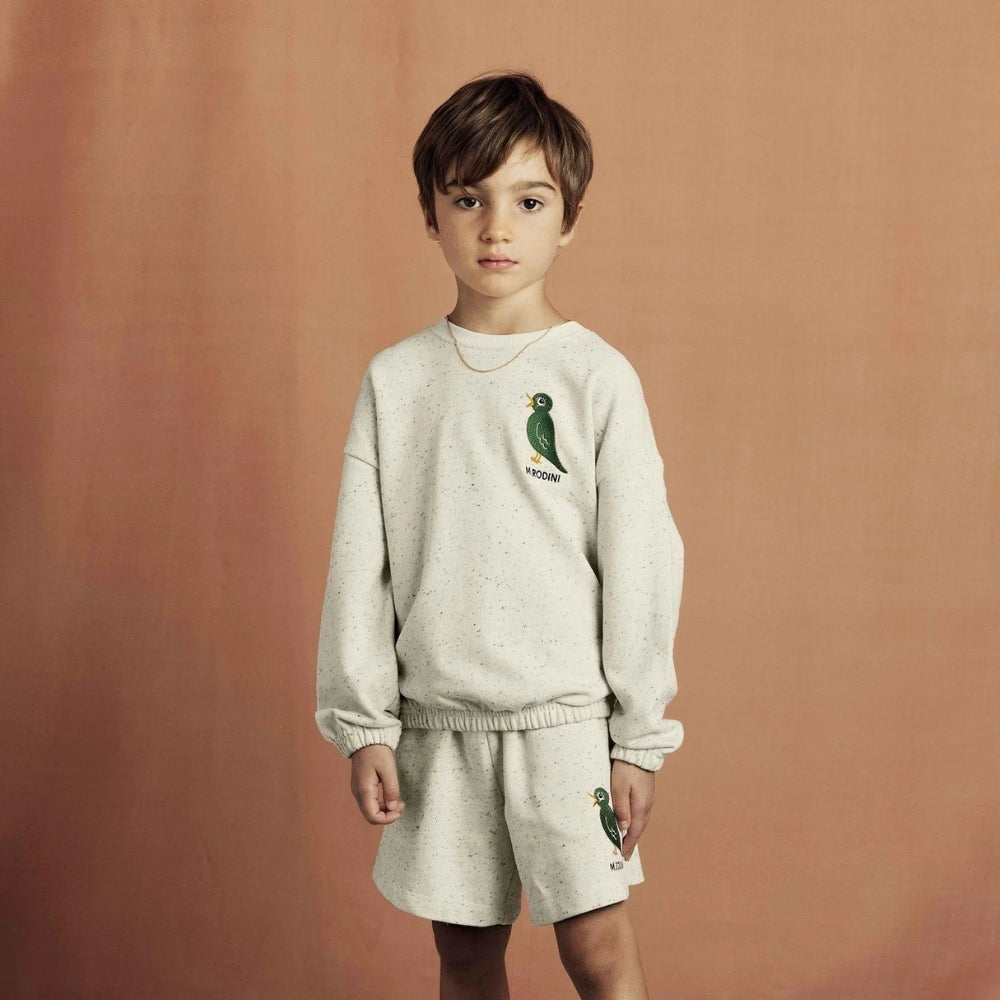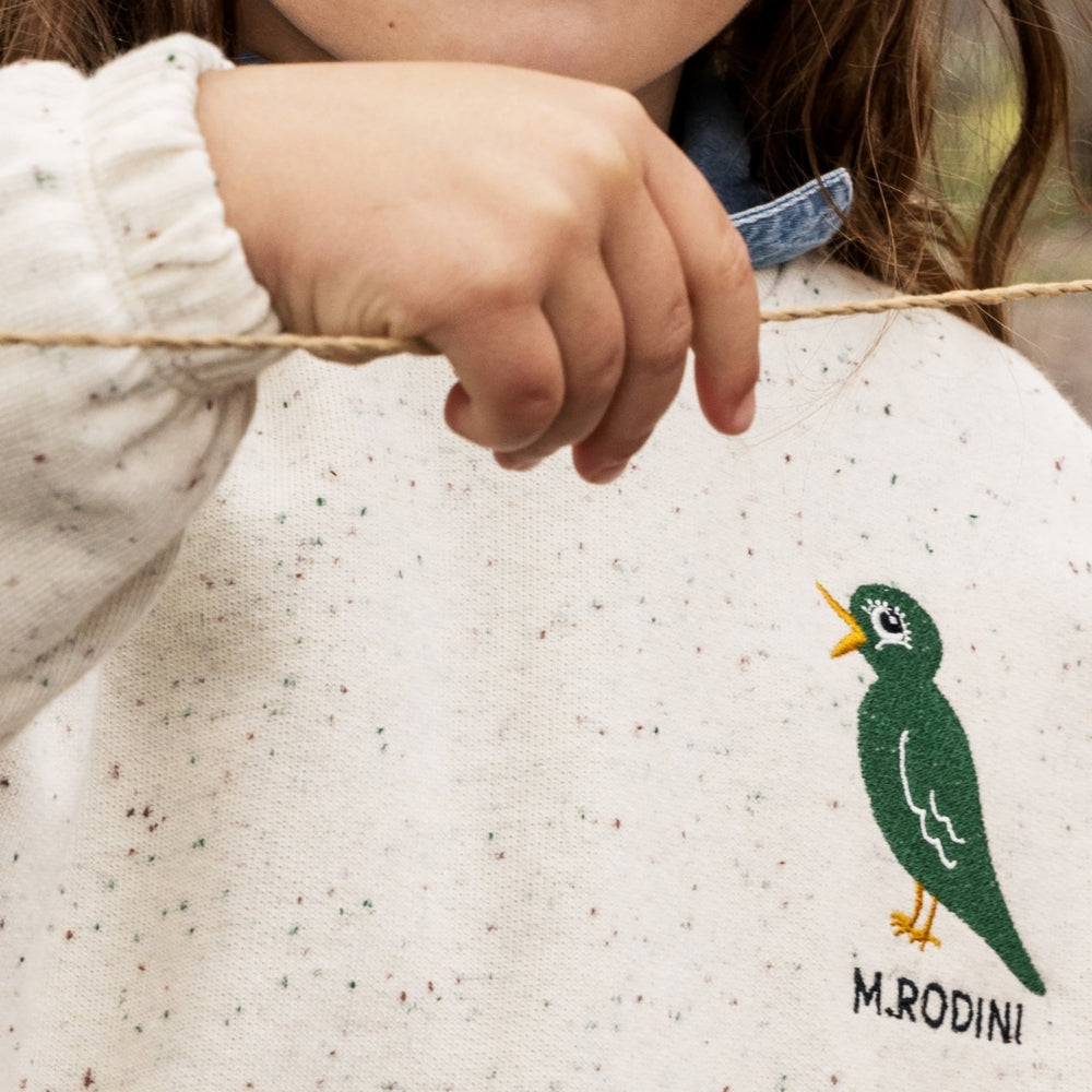 Rebrovaný golier zvýrazňuje ležérny štýl mikiny, zatiaľ čo jemná vyšívaná nášivka vtáčika na hrudi je jemným, ale výrazným detailom v súlade s estetikou značky Mini Rodini.