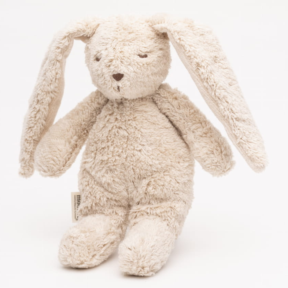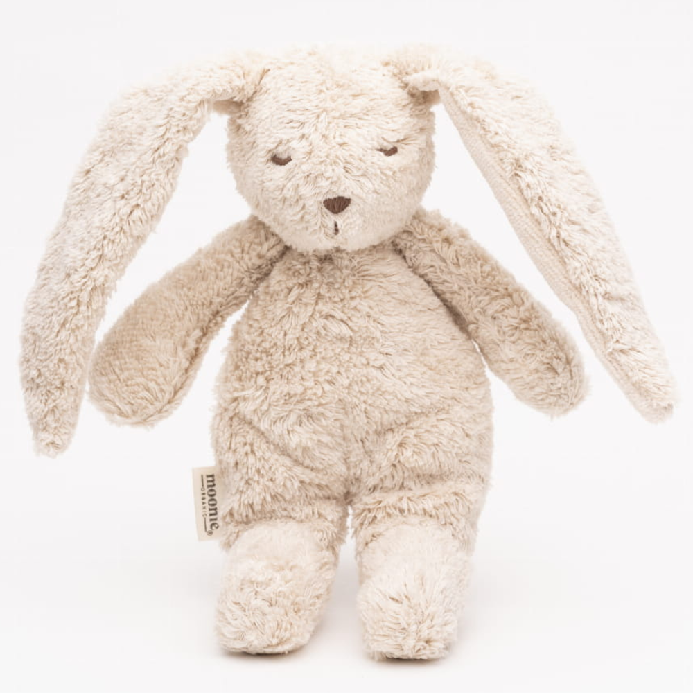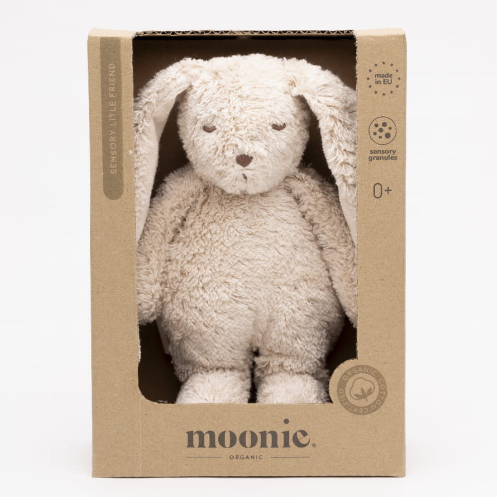Značka Moonie tu použila bezpečné, na dotyk príjemné materiály - organickú bavlnu a mäkkú výplň - takže hračka je vhodná aj pre citlivú detskú pokožku.