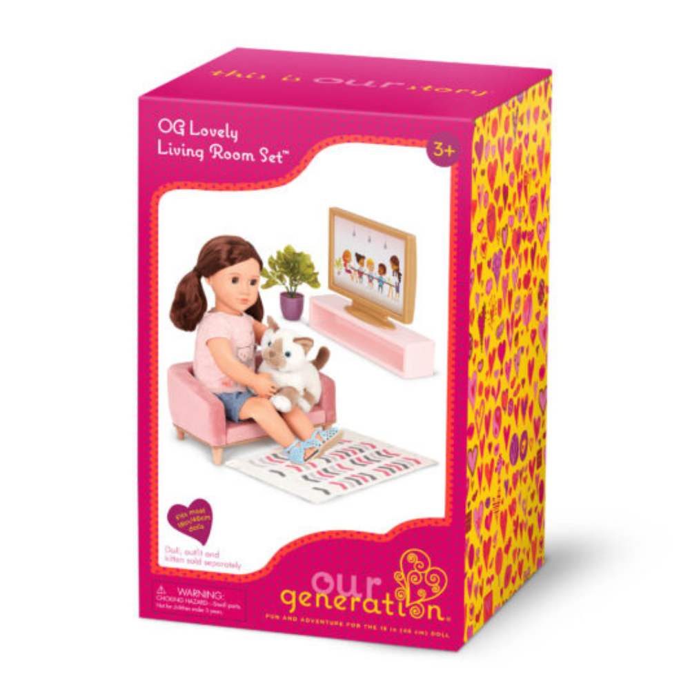 Súprava nábytku pre bábiky - obývacia izba s doplnkami od Our Generation je útulný priestor na hranie, ktorý premení detskú izbu na útulnú obývačku pre bábiky.