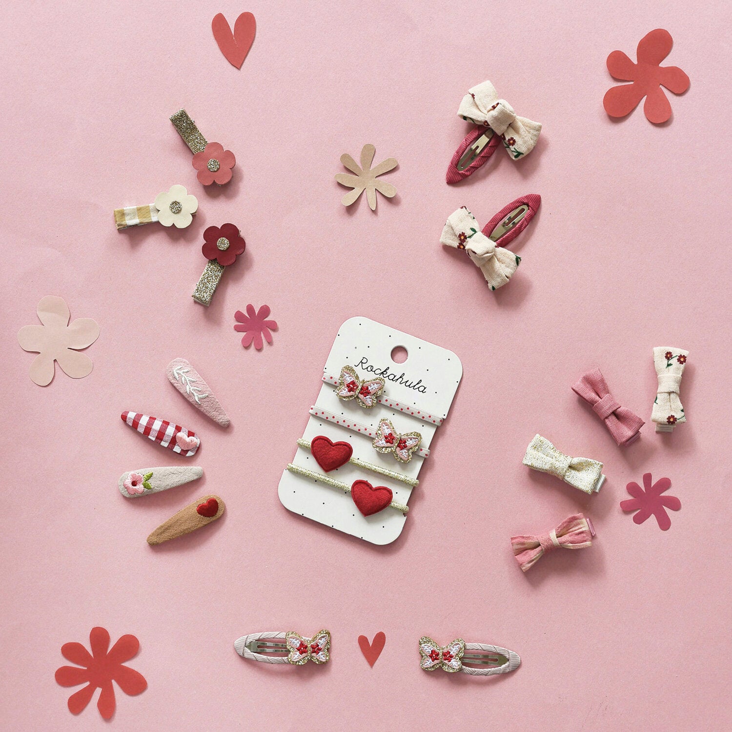 Súprava Rockahula obsahuje štyri ozdobné gumičky do vlasov: dve s ľudovými motýlikmi na bodkovaných gumičkách a dve s červenými zamatovými srdiečkami na zlatých gumičkách.