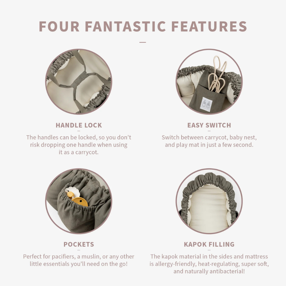 Tento inovatívny výrobok 3 v 1 funguje ako pohodlný detský kokón, prenosné nosidlo a veľká podložka na hranie, keď sa odpojia bočné časti.