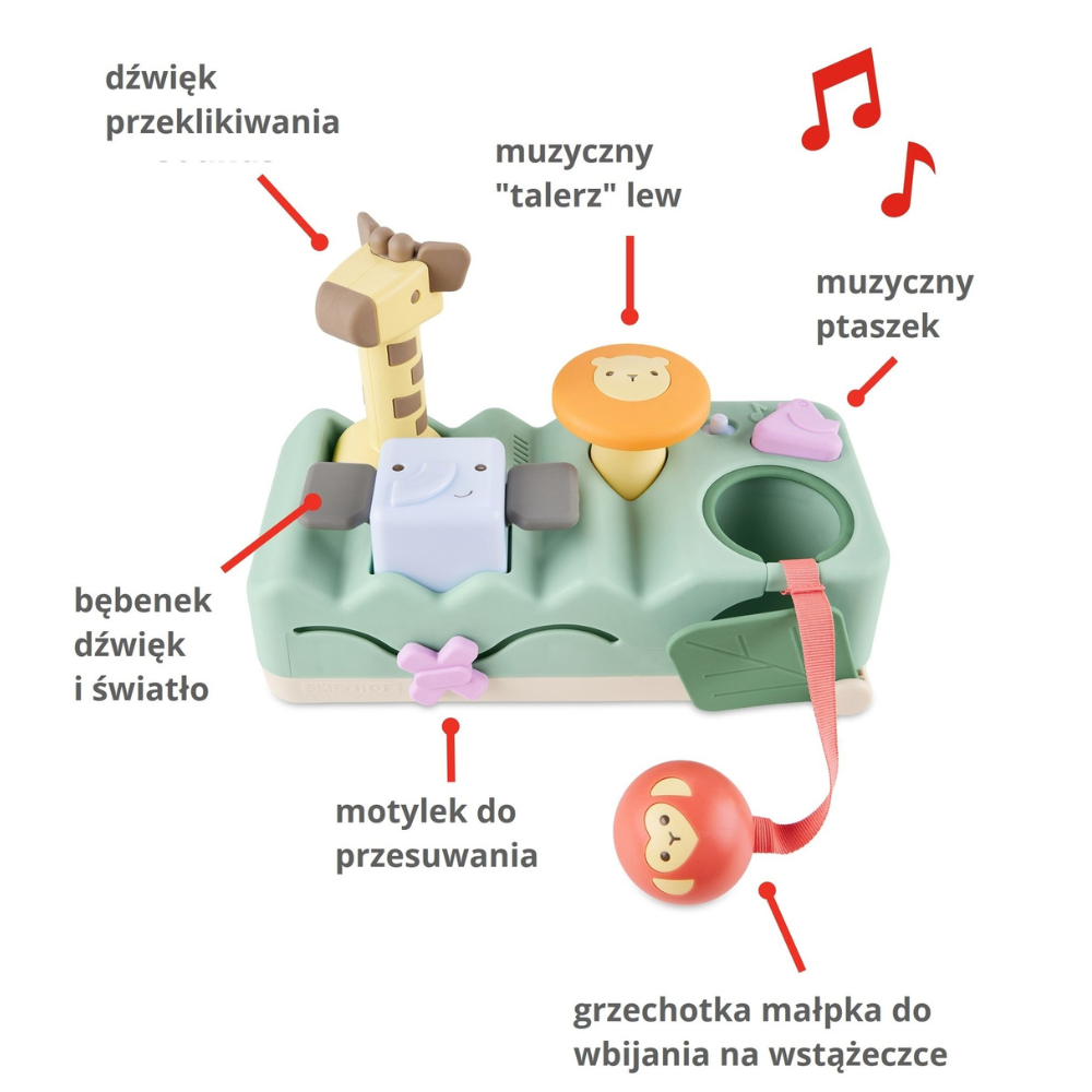 Hudobná a ťukajúca hračka obsahuje malé kladivko v tvare žirafy s mäkkými ušami a mäkkým nosom, svietiaci disk v tvare leva, bubon bongo v tvare slona, hudobného vtáčika, chrastítko s opičkou, list na schovávačku, šmýkačku s motýlikom a 12 zvukov zvierat, pesničiek, zvukov bubna a činelov.