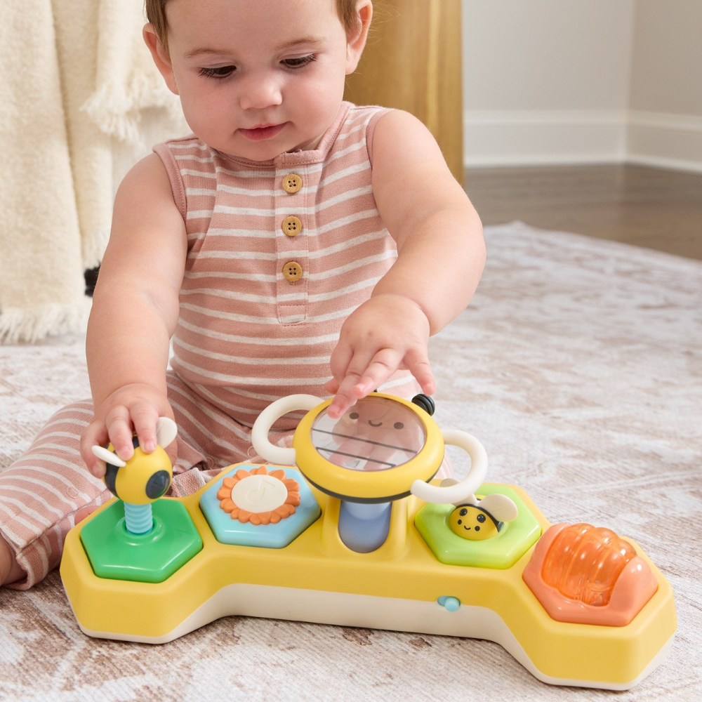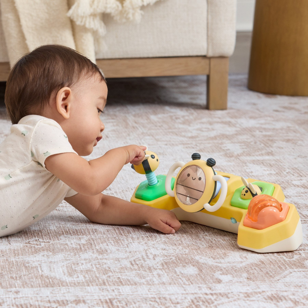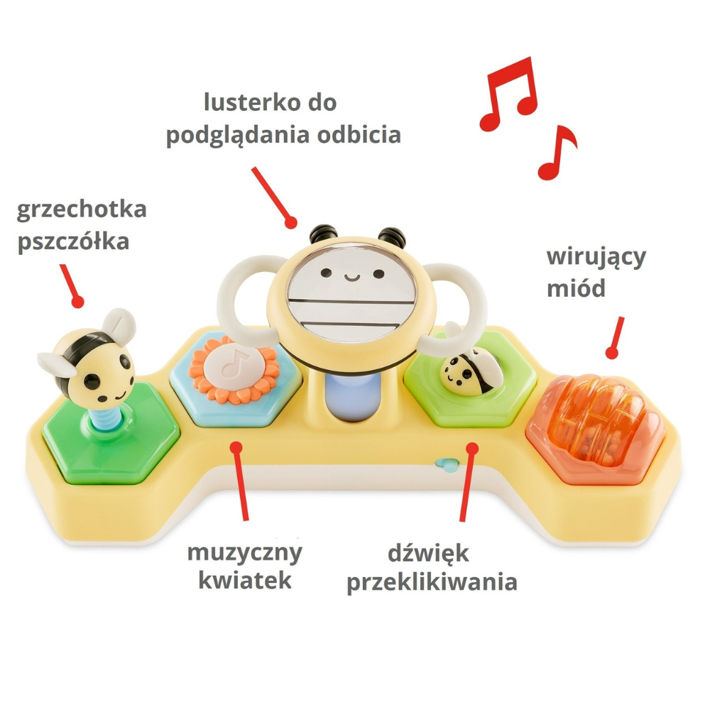 Interaktívna hračka Skip Hop Farmstand 2 v 1 Volant so včielkou je jedinečný výrobok navrhnutý tak, aby podporoval dieťa v dosahovaní nových úrovní rozvoja pri hre na brušku a v sede.