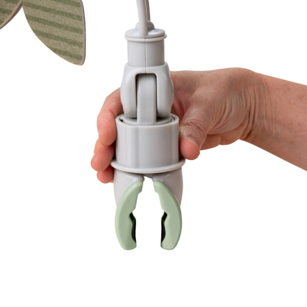 Čelenku s príveskami možno ľahko pripevniť vďaka univerzálnemu klipu a flexibilný dizajn umožňuje umiestniť hračky tak, aby boli presne v zornom poli dieťaťa.