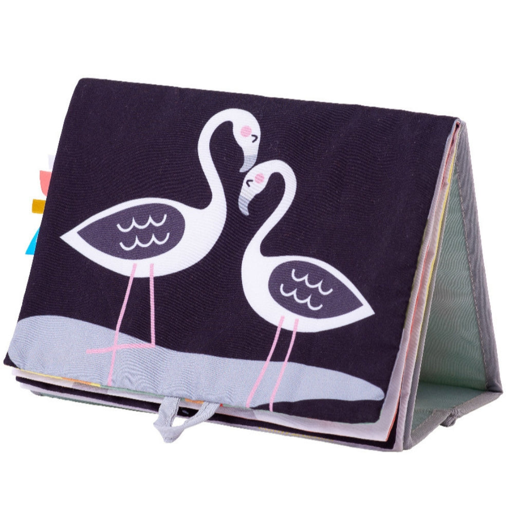 Mäkká interaktívna knižka Taf toys pre bábätká s dvoma stranami pre dve vývojové štádiá, na použitie v postieľke, kočíku a na hru na brušku.